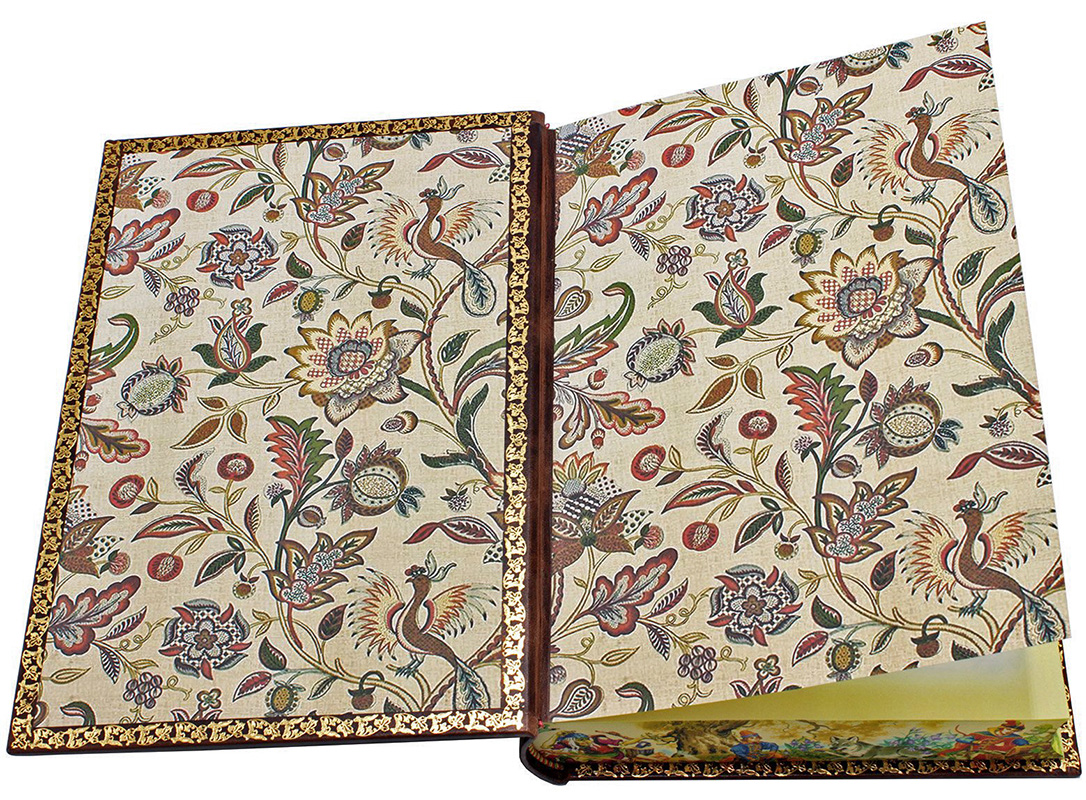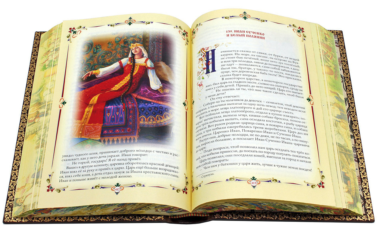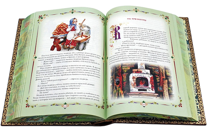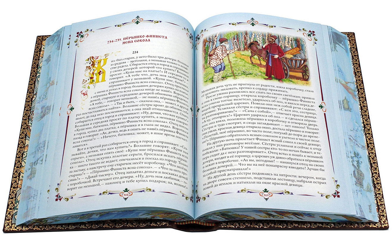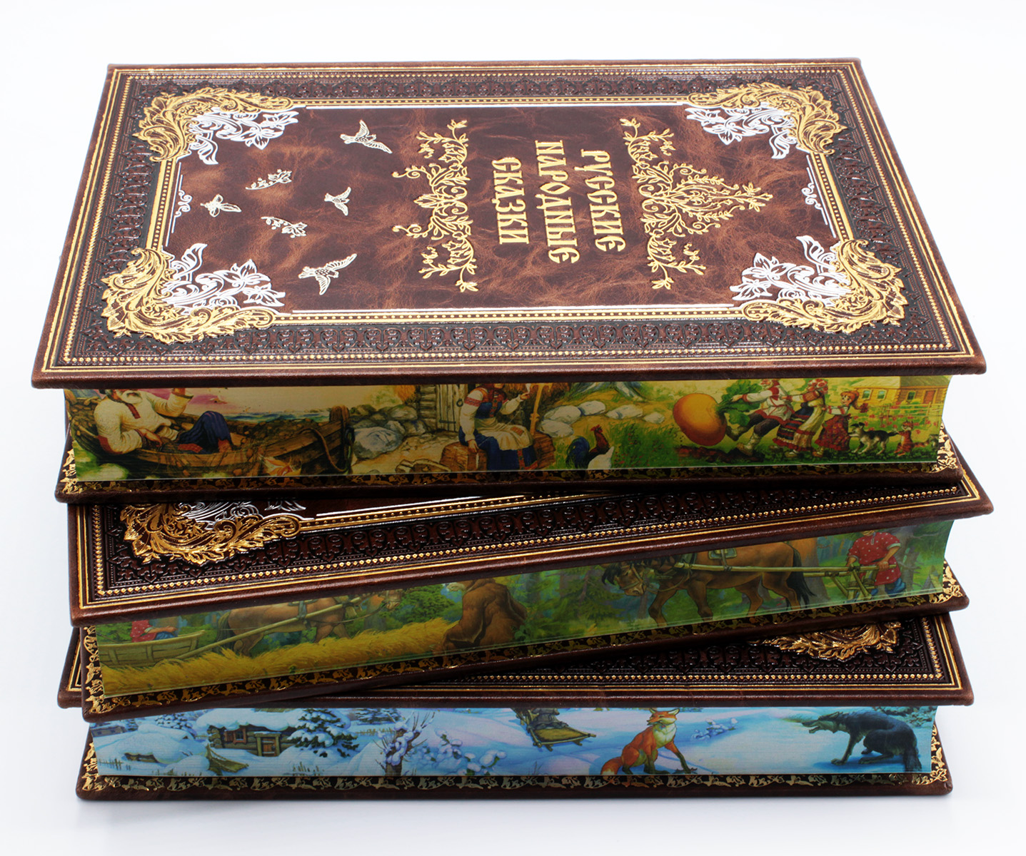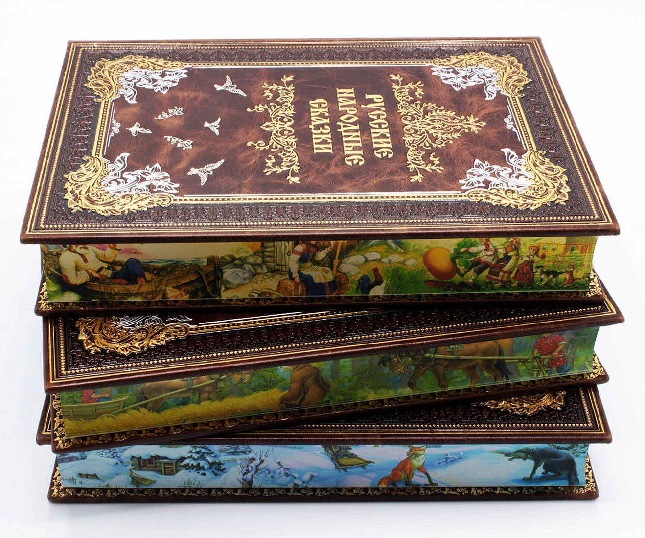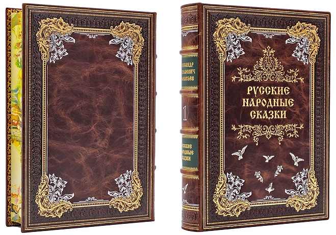 Сборник русских народных сказок А. Афанасьева, подарочное издание в кожаном переплете с красочными иллюстрациями, отпечатанное на дизайнерской бумаге. Золотое тиснение по коже, обрезы книжных блоков украшены тематическими рисунками, полностью ручная работа от нашего производства. Это собрание отличный подарок для дорогой семьи.