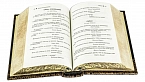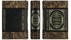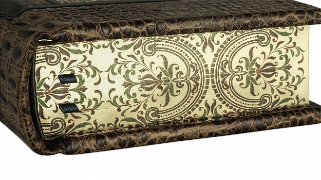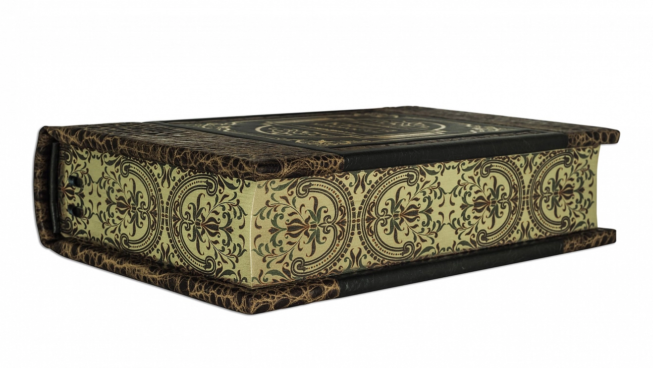 Составной переплет «Брадель», ручной работы, выполнен из комбинации натуральных кож (кожа «Chelsea Emerald», кожа «Drago in rilievo» производства итальянской кожевенной фабрики «Claudio»). Обложка книги двухуровневая, оформлена рельефным золотым тиснением (использована фольга «Luxor 240»). Обрез книги оформлен в уникальной технике художественной запечатки золотой основы.