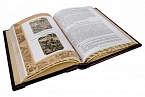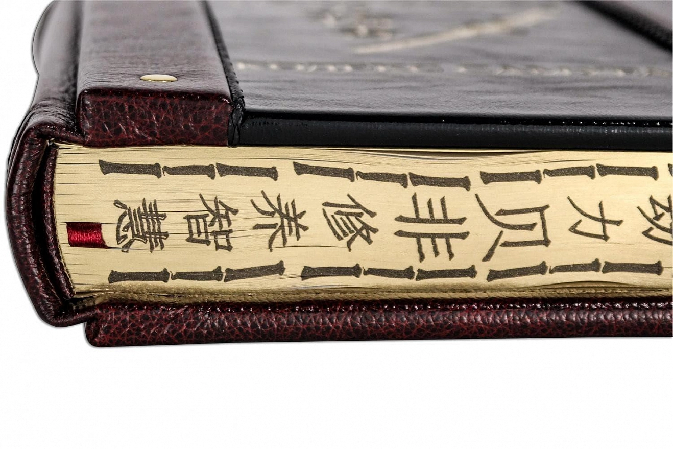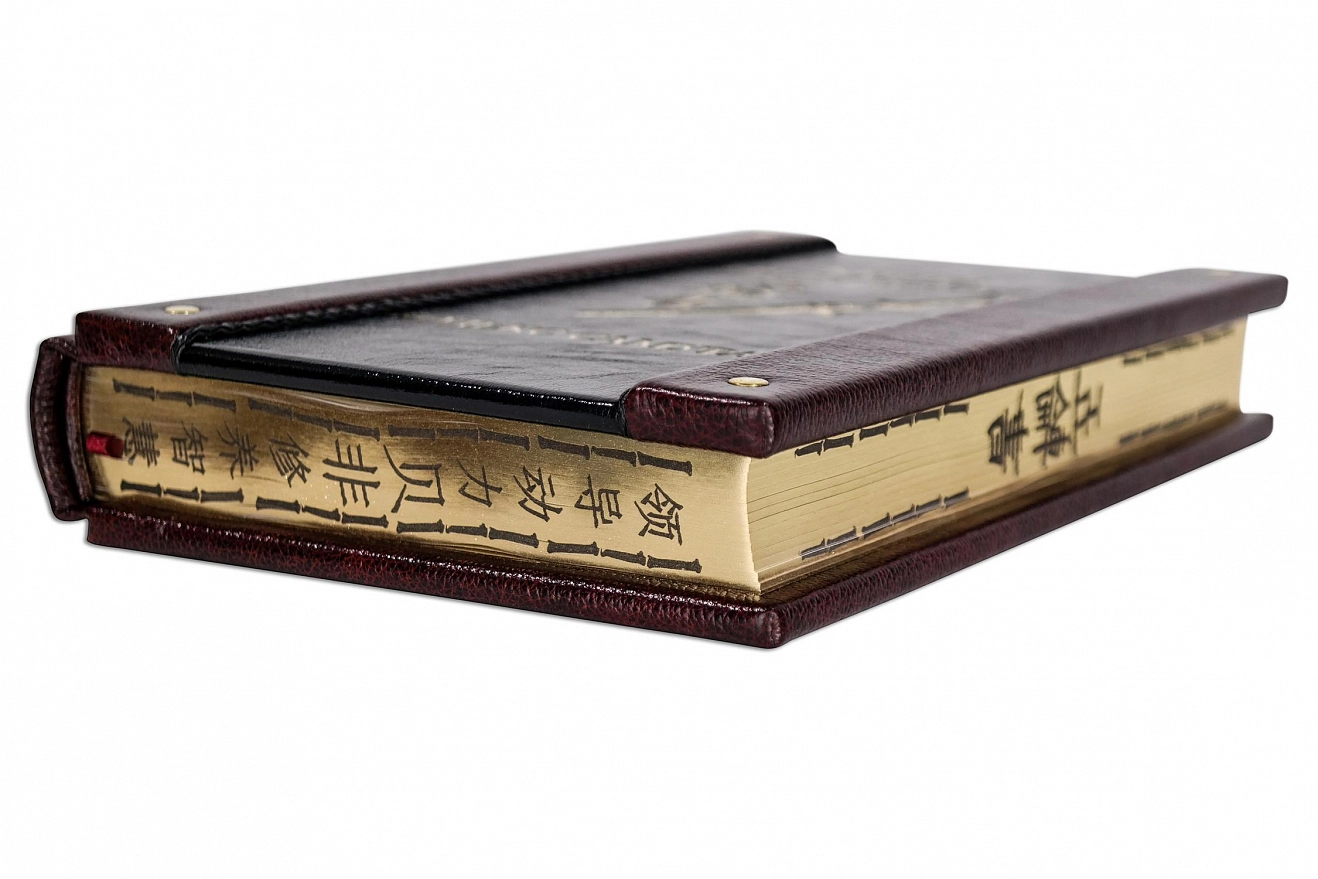Составной переплет «Брадель», ручной работы, выполнен из комбинации натуральных кож (кожа «Marma Rossa»; кожа «Robbat Nero» производства итальянской кожевенной фабрики «Claudio»). Обложка книги оформлена рельефным золотым тиснением, латунными хольнитенами (цвет «Gold»), плетеным кожаным шпагатом. Обрез выполнен в уникальной технологии художественной запечатки золотой основы.
