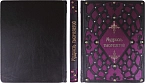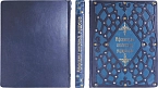 Составной переплет «Брадель», ручной работы, изготовлен из комбинации натуральных кож (кожа телячья «Gothik Blue», кожа телячья «Mare onda» производства ведущих итальянских фабрик). Обложка книги оформлена объемными узорами ручного затягивания в кожу, с инкрустацией камнями циркон (цвет лазурь) брильянтовой огранки высшего сорта (производство компании «Signity»), диаметром 5 мм, (количество 48 шт.). Латунными холитенами «Антик», количеством 18 шт.