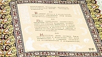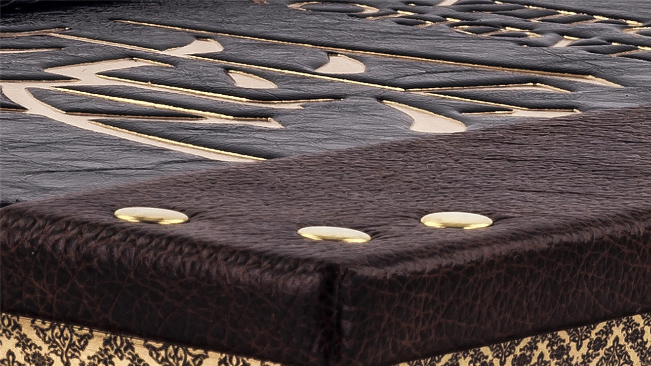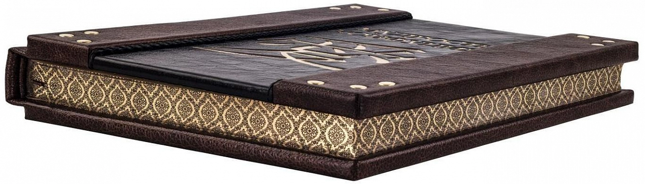 Составной переплет «Брадель», ручной работы, выполнен из комбинации натуральных кож (кожа «Marma Brown»; кожа черная лаковая «Avrora Vernice» производства итальянской кожевенной фабрики «Claudio»). Обложка книги двухуровневая, в классическом стиле, оформлена рельефным золотым тиснением, латунными холитенами, количеством 6 шт., плетеной кожаной тесьмой. Обрез книги выполнен в уникальной технологии художественной запечатки золотой основы.