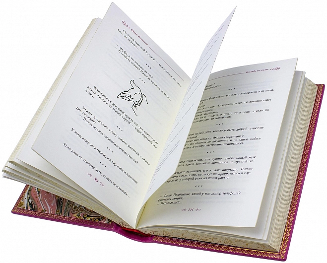 ФАИНА РАНЕВСКАЯ — АФОРИЗМЫ, ПОДАРОЧНОЕ ИЗДАНИЕ АННОТАЦИЯ Подарочное издание в кожаном переплете от нашей мастерской, полностью ручная работа, отличные материалы, изысканный французский стиль переплета книги. В книгу вошли все известные и неизвестные афоризмы и цитаты блистательной русской и советской актрисы Фаины Раневской. Прекрасный, памятный подарок для дорогого Вам человека. Данную книгу можно купить у нас или заказать бесплатную доставку. ИСПОЛНЕНИЕ Книга нашего издательства, отпечатана на превосходной бумаге «OZON IVORY» Германия. Индивидуально разработанный дизайн отделки обложки. Это полностью ручная работа, исторический, французский стиль переплета, золотое тиснение, книжный блок тонирован и покрыт золотым узором. Форзац из мраморной бумаги. В нашей мастерской Вы можете заказать индивидуальное оформление любой книги, так же можете посетить наше производство и посмотреть как создаются книги в кожаном переплете.