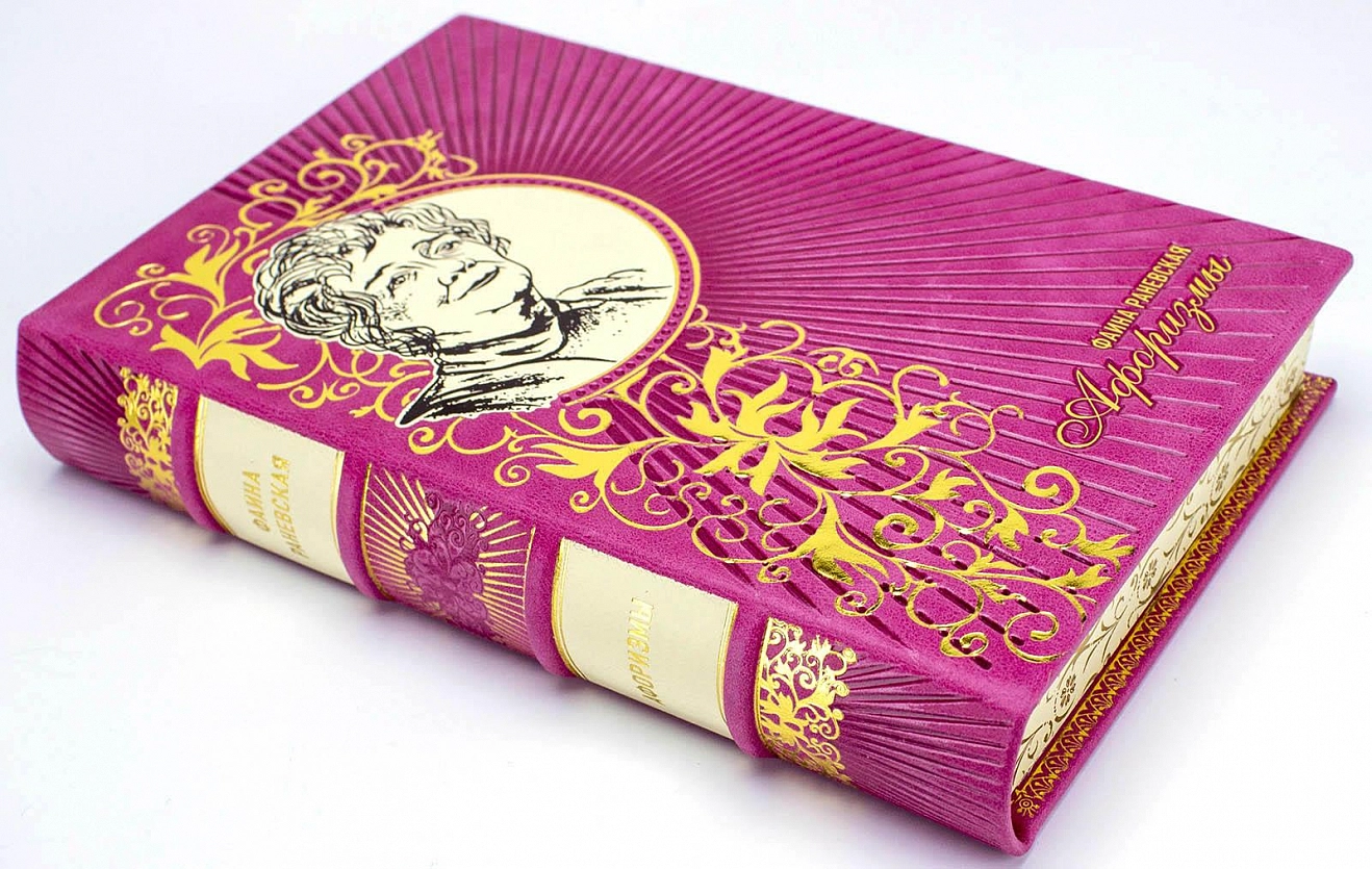 ФАИНА РАНЕВСКАЯ — АФОРИЗМЫ, ПОДАРОЧНОЕ ИЗДАНИЕ АННОТАЦИЯ Подарочное издание в кожаном переплете от нашей мастерской, полностью ручная работа, отличные материалы, изысканный французский стиль переплета книги. В книгу вошли все известные и неизвестные афоризмы и цитаты блистательной русской и советской актрисы Фаины Раневской. Прекрасный, памятный подарок для дорогого Вам человека. Данную книгу можно купить у нас или заказать бесплатную доставку. ИСПОЛНЕНИЕ Книга нашего издательства, отпечатана на превосходной бумаге «OZON IVORY» Германия. Индивидуально разработанный дизайн отделки обложки. Это полностью ручная работа, исторический, французский стиль переплета, золотое тиснение, книжный блок тонирован и покрыт золотым узором. Форзац из мраморной бумаги. В нашей мастерской Вы можете заказать индивидуальное оформление любой книги, так же можете посетить наше производство и посмотреть как создаются книги в кожаном переплете.