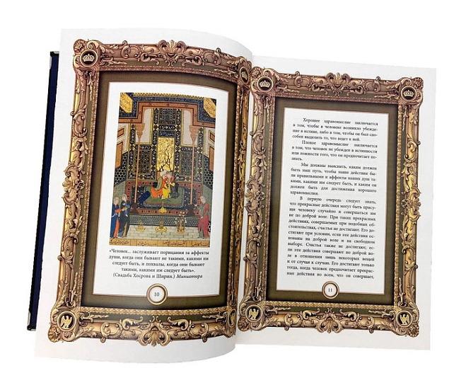 Книга представлена в оригинальном подарочном коробе, сделанном из мдф и обтянутым вручную высококачественной натуральной кожей. Цельнокожаный переплёт ручной работы, украшен иллюстрированной вставкой из цветного металла. Обложка двухуровневая. Металлические уголки дополняют дизайн и сохраняют книгу при использовании. Текст книги напечатан на мелованной бумаге и дополнен цветными иллюстрациями. Торшонированный обрез серебром. Ляссе из шёлковой ленты. Форзац цельный из дизайнерской бумаги.