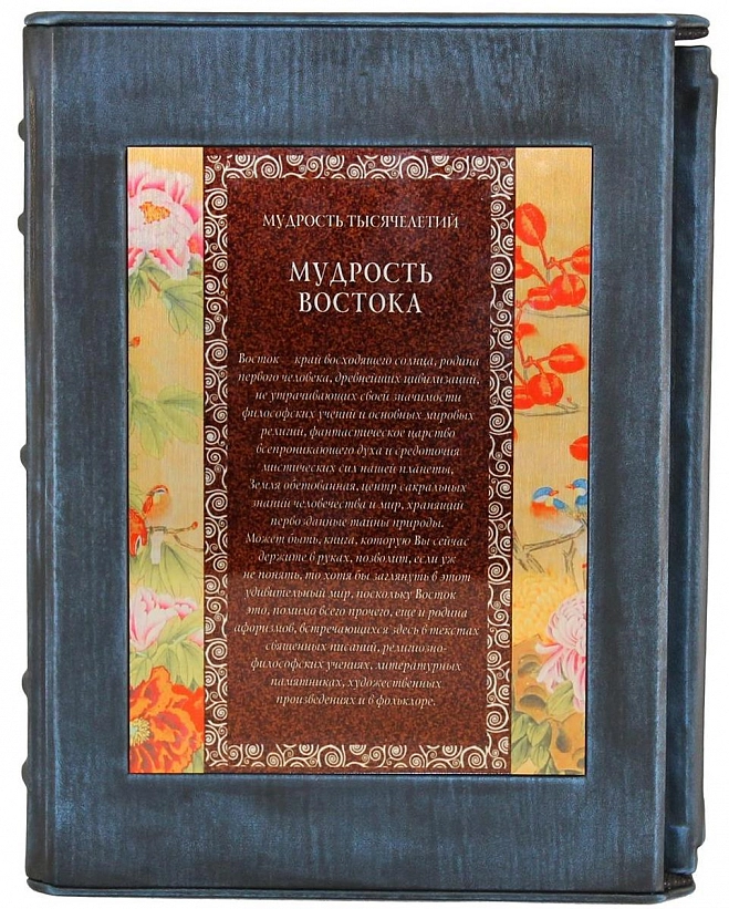 Мудрость Востока АННОТАЦИЯ Восток - край восходящего солнца, родина первого человека, древнейших цивилизаций, не утрачивающих своей значимости философских учений и основных мировых религий, фантастическое царство всепроникающего духа и средоточия мистических сил нашей планеты, Земля обетованная, центр сакральных знаний человечества и мир, хранящий первозданные тайны природы. Может быть, книга, которую вы сейчас держите в руках, позволит, если уж не понять, то хотя заглянуть в этот удивительный мир, поскольку Восток - это, помимо всего прочего, еще и родина афоризмов, встречающихся здесь в текстах священных писаний, религиозно-философских учениях, литературных памятниках, художественных произведениях и в фольклоре. ОПИСАНИЕ Цельнокожаный переплёт ручной работы, украшен иллюстрированной вставкой из цветного металла. Обложка двухуровневая. Текст книги напечатан на мелованной бумаге и дополнен цветными иллюстрациями. Обрез оформлен художественным изображением. Ляссе из шёлковой ленты. Форзац цельный из дизайнерской бумаги. Футляр кожаный, вдохновлён дизайном книги. Книга представлена в оригинальном подарочном коробе, перчатки и, по желанию, сертификат (может быть именным) в комплекте. Цветовое сочетание переплёта и упаковки может отличаться от представленных на фото.