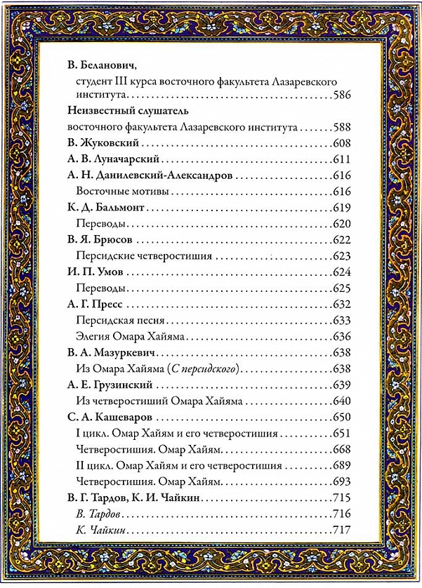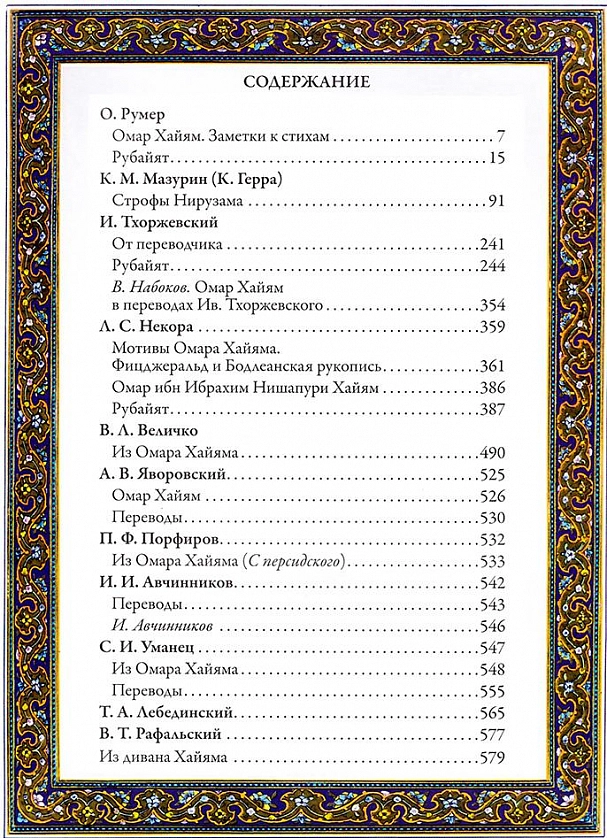Пять причин купить: 1 Уникальный сборник, включающий переводы стихов О. Хайяма, выполненные 24 русскими авторами в конце XIX и в начале XX века 2 Многие переводы напечатаны спустя 100 лет после их первой публикации 3 Сборник богато иллюстрирован работами британских художников – Э. Салливаном, Р. Буллом, Э. Дюлаком, Г. Россом и В. Погани 4 Статьи о творчестве О. Хайяма и о его влиянии на мировую литературу 5 Необычные элементы оформления сборника – виньетки, рамки и орнаменты – придают этому великолепному изданию изысканный восточный колорит"