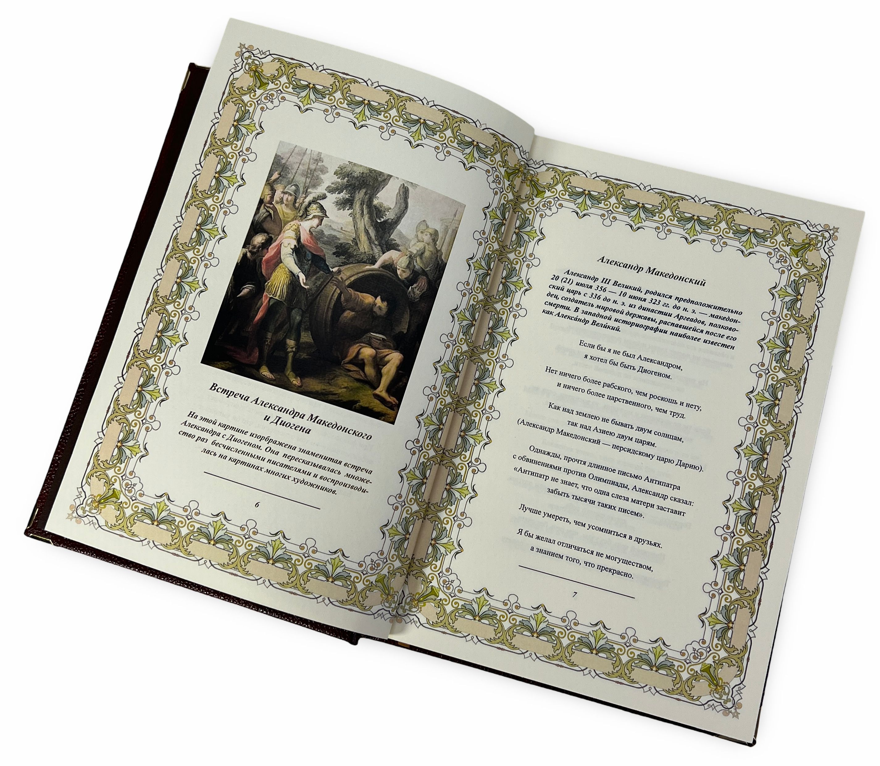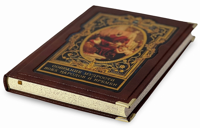 Подарочная книга "Собрание мудрости всех народов и времён" (в коробе) АННОТАЦИЯ Подарочное издание «Собрание мудрости всех народов и времен» — это сборник афоризмов, философских мыслей, цитат, различных оригинальных изречений известных философов, мудрецов, ученых, писателей, мыслителей, руководителей, полководцев, историков и многих других. В книге содержатся не только самые известные афоризмы и высказывания, но интересные факты о жизни и краткая биография их авторов. А интересные и оригинальные мысли великих людей, помогут Вам почерпнуть новые знания, мудрые фразы, цитаты и изречения. Афоризм — источник многовековой человеческой мудрости, экстракт мысли, заключенный в совершенную форму законченного лаконичного высказывания. В книге «Собрание мудрости всех народов и времен» читатель откроет для себя огромный мир многовековой мудрости, познакомится с мыслями и умозаключениями лучших представителей человечества. Сюда занесены слова выдающихся правителей и царей, истинных воинов и мифологических героев, лучших художников и поэтами Возрождения, а также известных политиков, актеров, художников, ученых, мыслителей всех времен и народов. Собрание хороших и красивых мыслей издавна, с древних времен, считали огромнейшим сокровищем. Знакомство с мудростью, накопленной человечеством, возможно, поможет читателям избежать многих ошибок и даст импульс в стремлении к совершенству. Книга, достоинство которой заключается в тонкости наблюдений над природой человека и вещей, никогда не может перестать нравиться. ОПИСАНИЕ Цельнокожаный переплёт ручной работы, украшен иллюстрированной вставкой из цветного металла. Обложка двухуровневая. Металлические уголки дополняют дизайн и сохраняют книгу при использовании. Текст книги напечатан на мелованной бумаге и дополнен цветными иллюстрациями. Обрез оформлен художественным изображением. Ляссе из шёлковой ленты. Форзац цельный из дизайнерской бумаги.