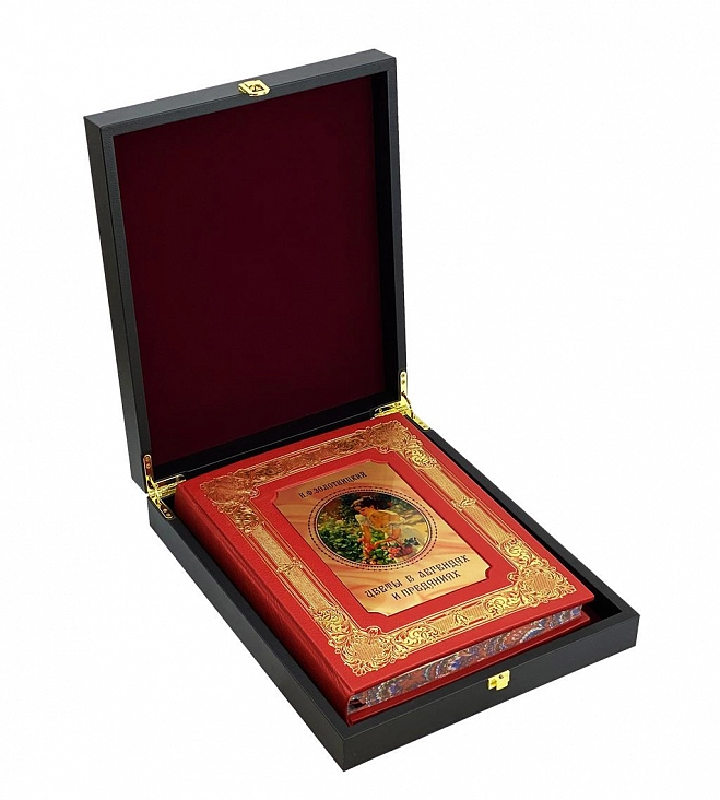 Издание представлено в оригинальной подарочной коробке. Дизайн прекрасно сочетает в себе золотое и блинтовое тиснение, художественную металлическую вставку, соответствующую тематике издания, а также крашенный в тон переплетного материала обрез. Цельнокожаный переплет ручной работы Высококачественная бумага, красочные иллюстрации, ляссе.