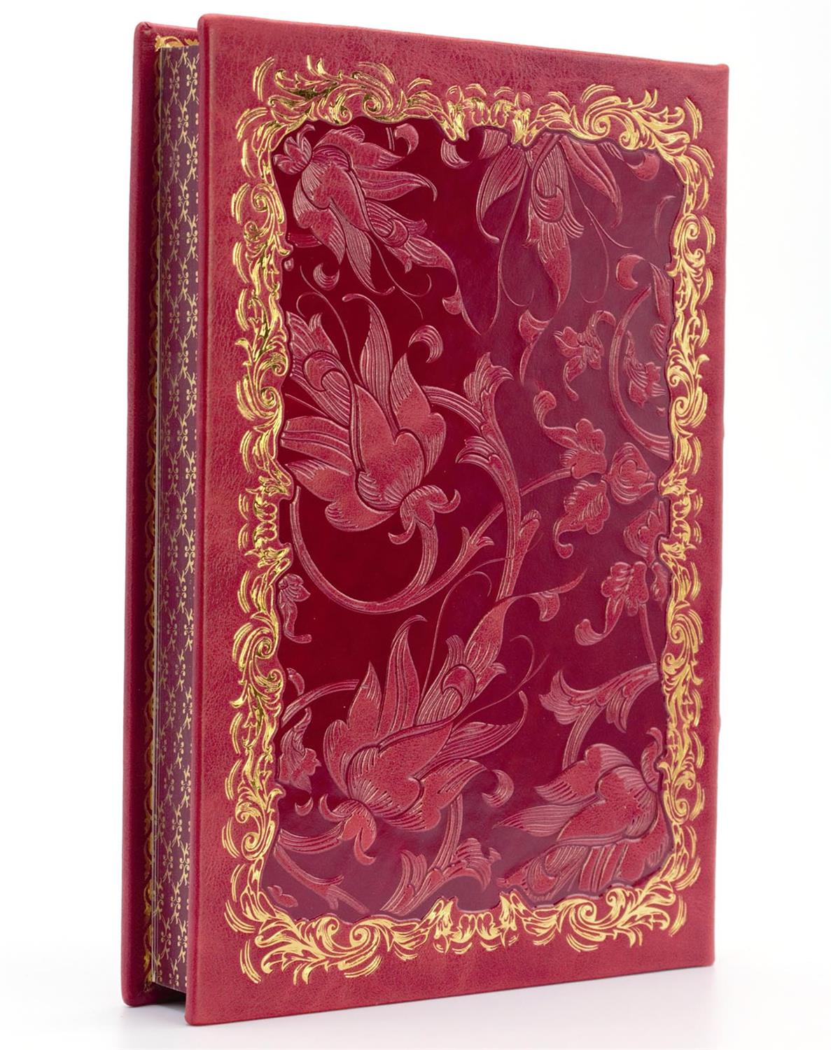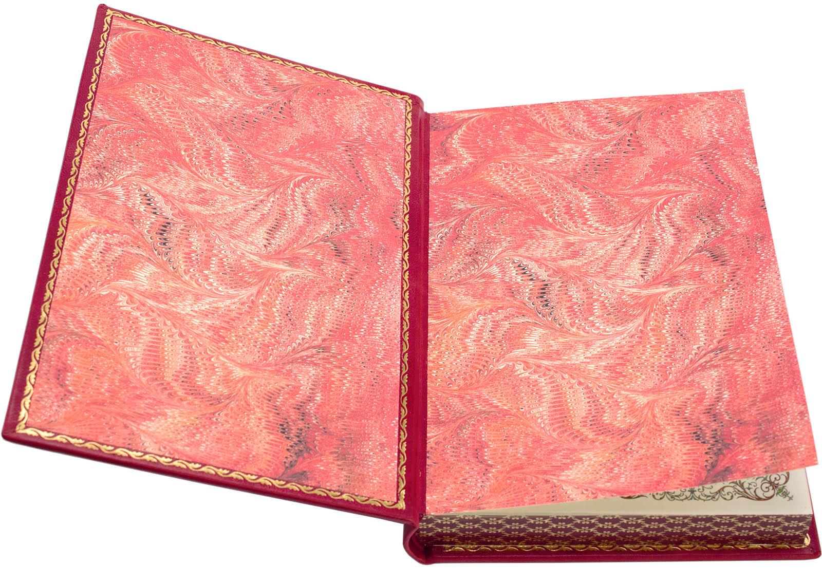 Кожаный переплет ручной работы в стиле "французский переплет". Золотое, блинтовое, фигурное тиснения и тиснение цветной фольгой. Бинты на корешке. Трехсторонний обрез книги ошкурен и окрашен вручную, прокатка узора золотом в верхней части . Форзац выполнен из дизайнерской бумаги. Печать цветная, бумага мелованная. Книга представлена в подарочном коробе. Разработка дизайна и оформление переплёта - переплётная мастерская Идеальная библиотека.
