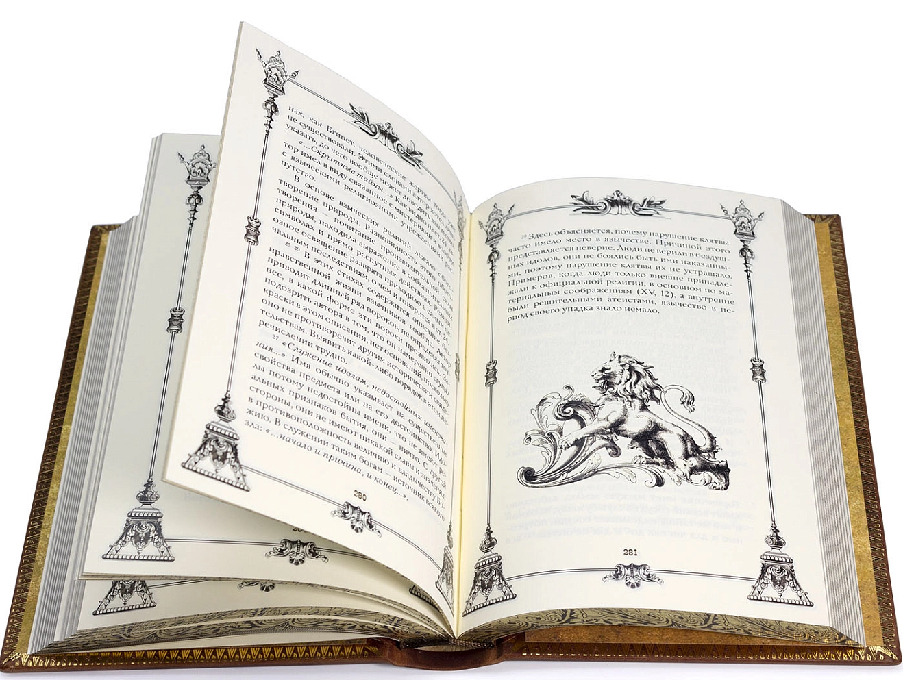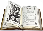 Исторический французский стиль кожаного переплета, уникальное рельефное и цветное тиснение. Книги отпечатаны на дизайнерской бумаге с иллюстрациями исторических гравюр. Обрезы блока страниц вручную отшлифованы и нанесен золотой орнамент, что не только украшает книгу, но и сохраняет на долгое время состояние страниц книг.