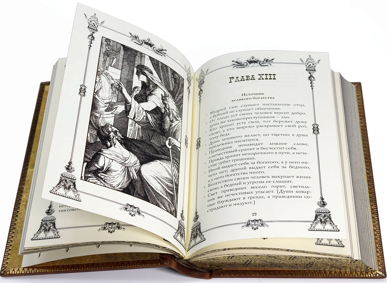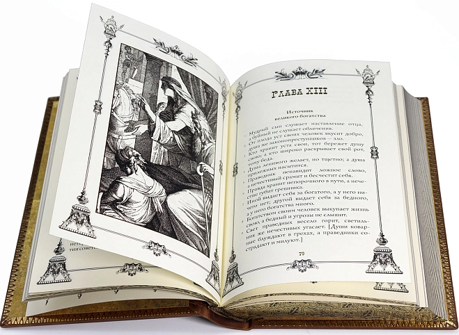 КНИГА ПРИТЧ ЦАРЯ СОЛОМОНА В ПОДАРОЧНОМ ИЗДАНИИ АННОТАЦИЯ Подарочная книга притч царя Соломона в историческом кожаном переплете, отпечатана на дизайнерской бумаге, с цветовым оттенком близким к свиткам. В книги вы найдете интересные древние гравюры и мудрые наставление, которые не потеряли своей актуальности и сегодня. ИСПОЛНЕНИЕ Исторический французский стиль кожаного переплета, уникальное рельефное и цветное тиснение. Книги отпечатаны на дизайнерской бумаге с иллюстрациями исторических гравюр. Обрезы блока страниц вручную отшлифованы и нанесен золотой орнамент, что не только украшает книгу, но и сохраняет на долгое время состояние страниц книг. Издание подарочных, коллекционных книг небольшими тиражами в исторических кожаных переплетах, создание многотомных собраний сочинений для домашних библиотек, все это наше призвание. ОПИСАНИЕ Есть в Библии семь священных книг, именуемых "учительными" или "премудростными". "Книга притчей Соломоновых" - из их числа. Эта книга входит в состав Ветхого Завета. Ее творцом с древности считается Соломон, третий царь Иудейский, правитель объединенного Израильского царства в период его наивысшего расцвета, строитель величайшей святыни иудаизма - Иерусалимского храма. Притчи Соломона, сына Давидова, царя Израильского, чтобы познать мудрость и наставление, понять изречения разума; усвоить правила благоразумия, правосудия, суда и правоты; простым дать смышленость, юноше – знание и рассудительность; послушает мудрый – и умножит познания, и разумный найдет мудрые советы ... Именно мудрости учит его книга, преподнося ее как высшее благо и единственно достойный предмет человеческих устремлений. Книга Притчей Соломоновых — книга, входящая в состав еврейской Библии (Танаха) и Ветхого Завета. Вторая книга раздела Ктувим еврейской Библии. Двадцатая каноническая книга христианской Библии (Синодальный перевод). В Притчах Соломона есть стихи, которые очень схожи с древнеегипетским «Поучением Аменемопе» не только по общему смыслу, но и по тексту.