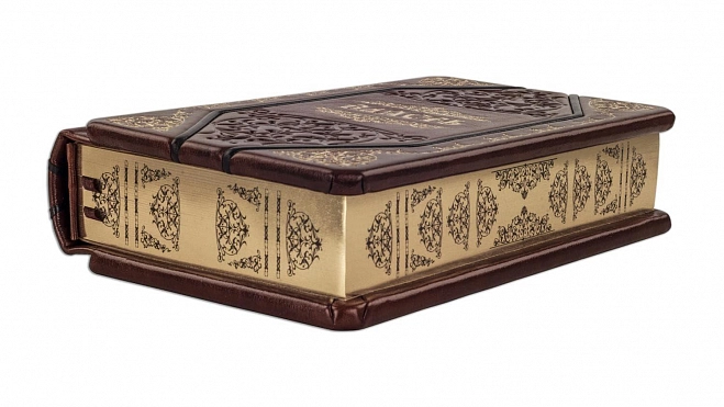 Составной переплет «Брадель», ручной работы, выполнен из комбинации натуральных кож (кожа «Grash», кожа «Vetro grigio» производства итальянской кожевенной фабрики «Benericetti»). Обложка книги оформлена многоуровневым тиснением - глубоким блинтовым и рельефным золотым, с использованием фольги «Luxor 240». Обрез книги выполнен в уникальной технологии художественной запечатки золотой основы.