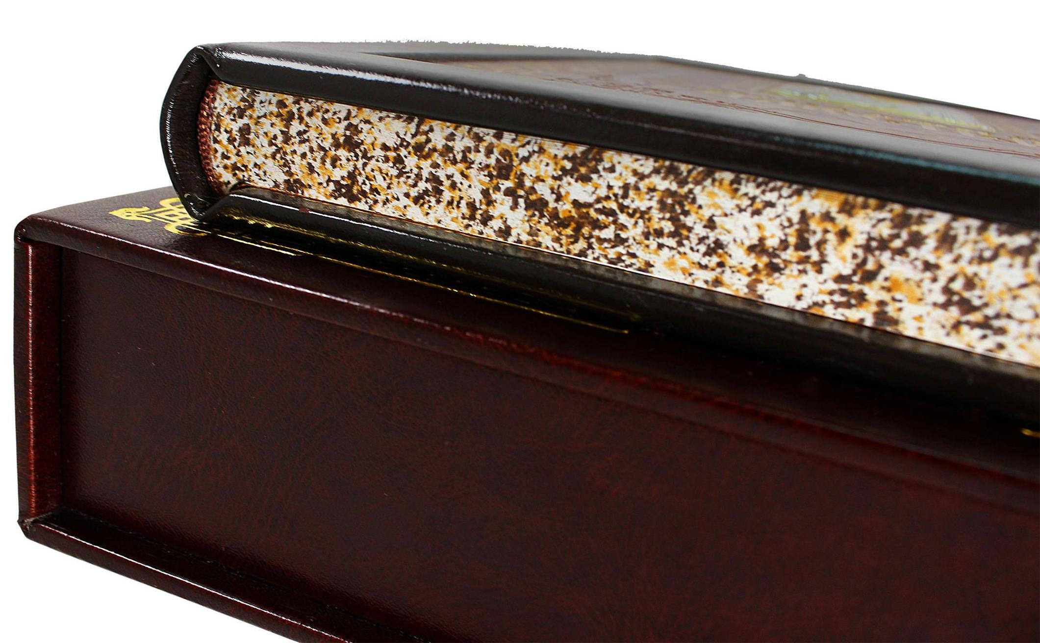 Наша переплетная мастерская предлагает Вам купить это издание в эксклюзивном оформлении. Французский стиль кожаного переплета, высокого качества переплетная кожа с золотым тиснением, обрез книжного блока вручную отшлифован и тонирован индивидуальным узором. Так же вручную изготовлен подарочный футляр для книги. Изысканная работа наших мастеров!
