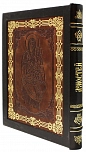 Кожаный переплет ручной работы. Выполнен в стиле «Французский переплет». Обложка в двух уровнях. Золотое и блинтовое тиснения. Украшена иконой «Святое семейство» из позолоты и серебра. Обрез ошкурен, отшлифован и тонирован вручную. В комплекте подарочный короб.