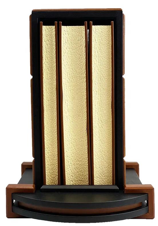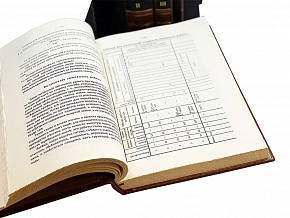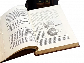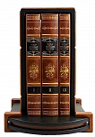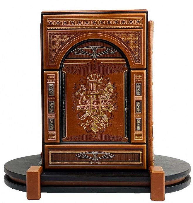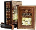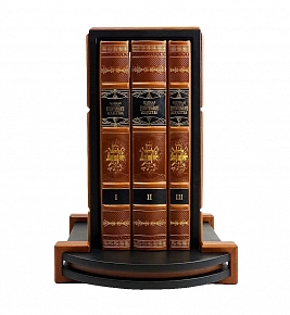 Подарочное репринтное издание в 3-х томах, каждая книга которая представлена в цельнокожаном переплете ручной работы, включает в своем дизайне сочетание золотого и черного тиснения, выполненных на высококачественной натуральной коже. Деревянная подставка обтянутая натуральной кожей. Торшонированный обрез с золотой накаткой. Форзацы оформлены дублюрами. Ляссе.