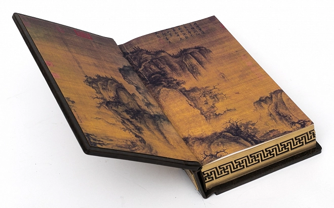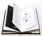 Составной переплет «Брадель» ручной работы, выполнен из эксклюзивной кожи «Vintage Olive» производства итальянской фабрики «Carisma». Обложки книг и подарочный пенал оформлены многоуровневым тиснением: глубоким блинтовым и рельефным золотым, а также медными элементами с чеканкой китайских иероглифов. Форзацы выполнены из холста с цветной печатью репродукций древних восточных полотен. Обрезы книг вручную позолочены и декорированы глубокой гравировкой. Все три тома заключены в роскошный пенал, обшитый кожей, оформленный в едином стиле с книжными обложками.