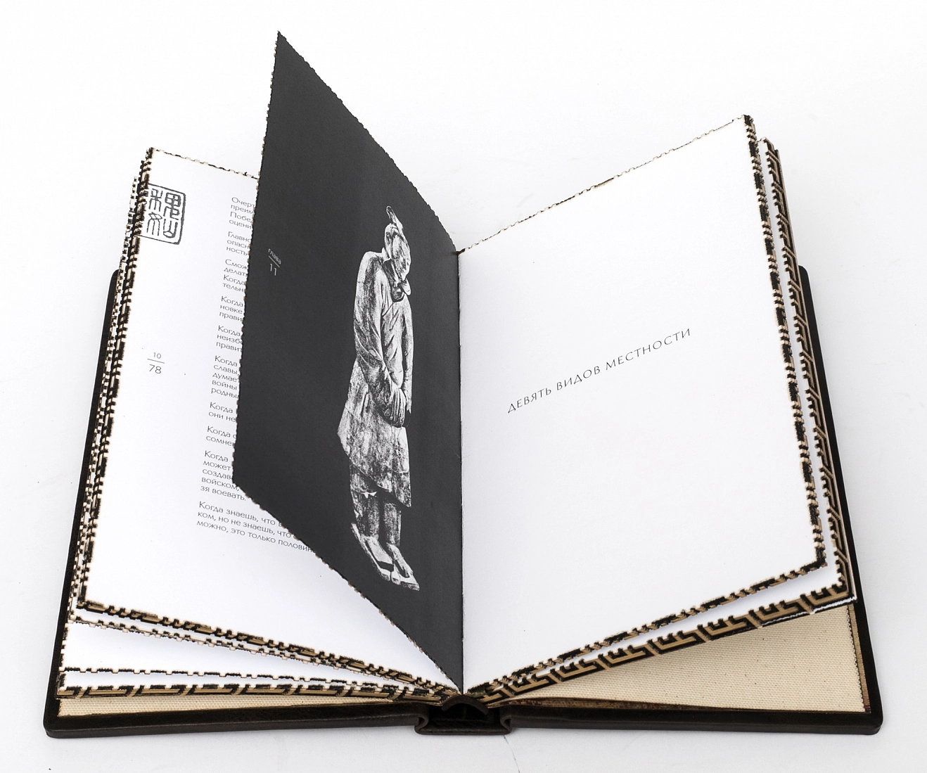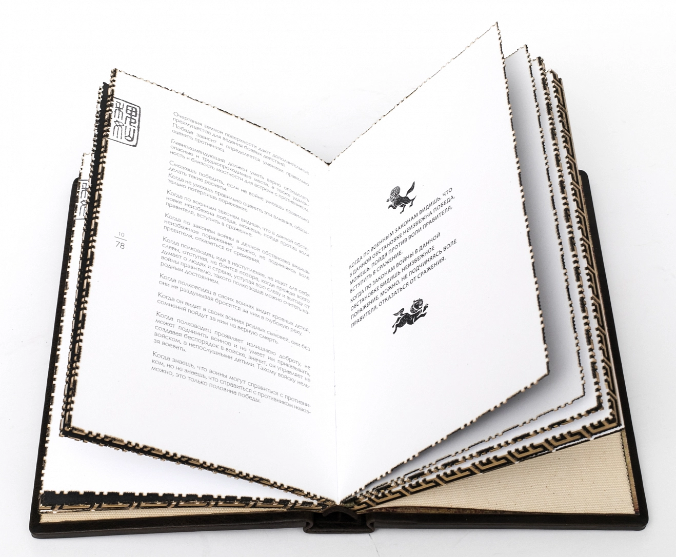 Составной переплет «Брадель» ручной работы, выполнен из эксклюзивной кожи «Vintage Olive» производства итальянской фабрики «Carisma». Обложки книг и подарочный пенал оформлены многоуровневым тиснением: глубоким блинтовым и рельефным золотым, а также медными элементами с чеканкой китайских иероглифов. Форзацы выполнены из холста с цветной печатью репродукций древних восточных полотен. Обрезы книг вручную позолочены и декорированы глубокой гравировкой. Все три тома заключены в роскошный пенал, обшитый кожей, оформленный в едином стиле с книжными обложками.
