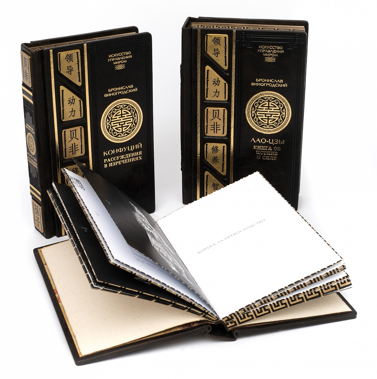 Подарочные книги: «Искусство управления миром» Бронислав Виногродский (в 3 томах) АННОТАЦИЯ В собрании книг «Искусство управления миром» заключен тысячелетний опыт китайских мудрецов и правителей. Это собрание, в первую очередь, предназначено для людей, которые хотят управлять своим миром, поскольку никаким другим миром управлять невозможно. Чтобы управлять, нужно иметь представление о предмете управления. Но как создать правильное представление о собственном мире, если нет правильных представлений о самом себе? Согласно философии Лао-Цзы, человек, который управляет своими состояниями, своими действия – управляет и обстоятельствами. В этом и заключаются три основных аспекта человеческой личности, которые в даосизме сформулированы следующим образом: мастер творческих состояний, мастер осознанных действий и мастер управляемых совпадений. Об этой и других концепциях идет речь в книгах из собрания «Искусство управления миром». В собрание вошли: 1. Конфуций «Рассуждения в изречениях» 2. Лао-Цзы «Книга об истине и силе» 3. Сунь-Цзы «Искусство побеждать» ОФОРМЛЕНИЕ Составной переплет «Брадель» ручной работы, выполнен из эксклюзивной кожи «Vintage Olive» производства итальянской фабрики «Carisma». Обложки книг и подарочный пенал оформлены многоуровневым тиснением: глубоким блинтовым и рельефным золотым, а также медными элементами с чеканкой китайских иероглифов. Форзацы выполнены из холста с цветной печатью репродукций древних восточных полотен. Обрезы книг вручную позолочены и декорированы глубокой гравировкой. Все три тома заключены в роскошный пенал, обшитый кожей, оформленный в едином стиле с книжными обложками. Персональный сертификат с индивидуальным текстом поздравления. Бархатный мешочек. Деревянный кейс. Формат книги: 158х247х45 мм. Вес книги: 1,5 кг. Общий вес комплекта: 5,8 кг. Готовые книги могут незначительно отличаться от представленных на фото.