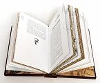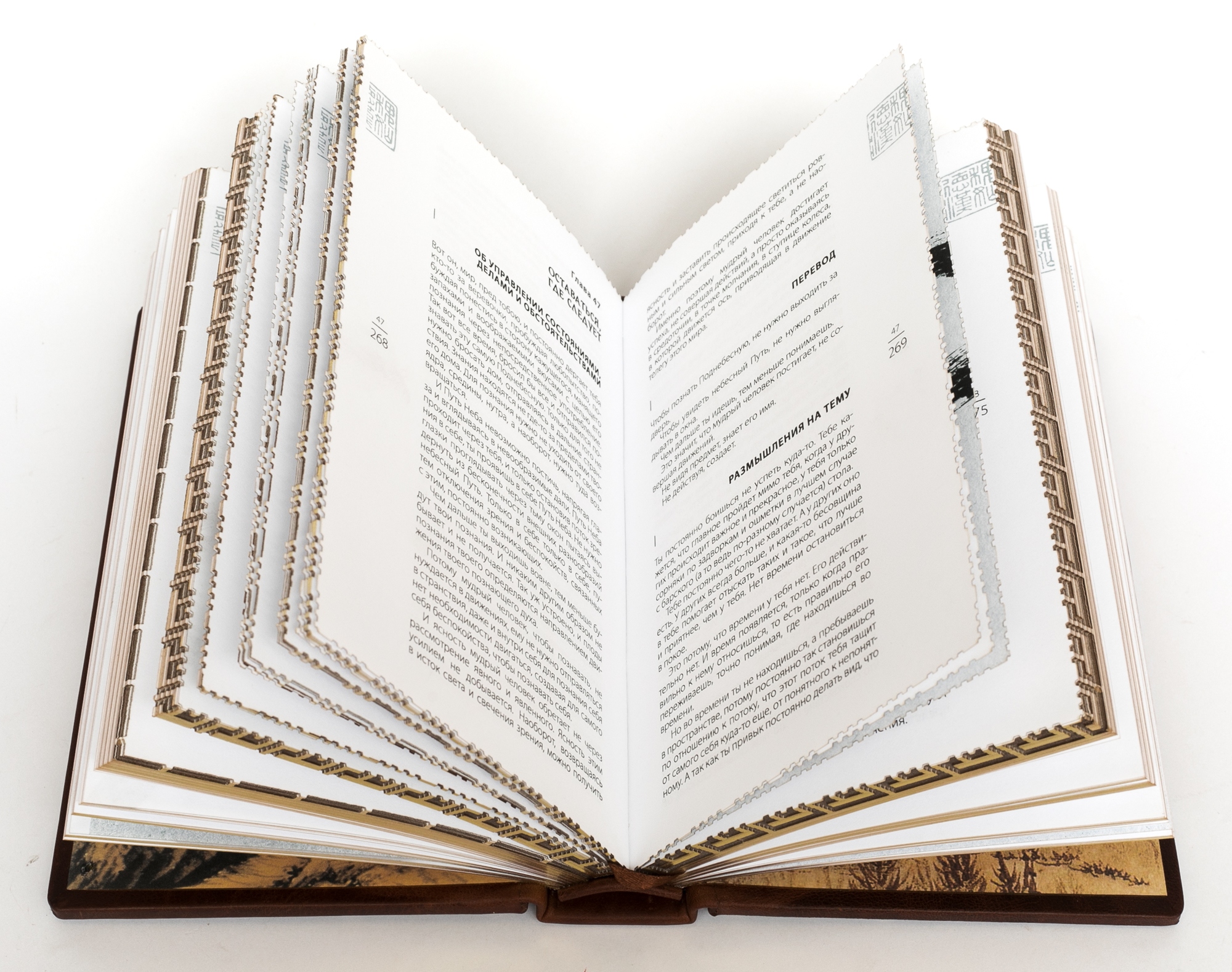 Составной переплет «Брадель», ручной работы, выполнен из эксклюзивной кожи «Vetromarronevernice» производства итальянской фабрики «Carisma». Обложки книг и подарочный пенал оформлены многоуровневым тиснением: глубоким блинтовым и рельефным золотым, а также медными элементами с чеканкой китайских иероглифов. Форзацы книг выполнены из холста с цветной печатью репродукций древних восточных полотен. Обрезы книг вручную позолочены и декорированы глубокой гравировкой. Все пять томов заключены в роскошный пенал, обшитый кожей, оформленный в едином стиле с книжными обложками.