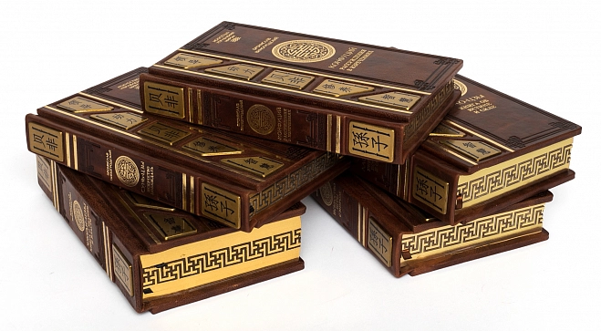 ИСКУССТВО УПРАВЛЕНИЯ МИРОМ (В 5-ТИ ТОМАХ) АННОТАЦИЯ В собрании книг «Искусство управления миром» заключен тысячелетний опыт китайских мудрецов и правителей. Это собрание, в первую очередь, предназначено для людей, которые хотят управлять своим миром, поскольку никаким другим миром управлять невозможно. Чтобы управлять, нужно иметь представление о предмете управления. Но как создать правильное представление о собственном мире, если нет правильных представлений о самом себе? Согласно философии Лао-Цзы, человек, который управляет своими состояниями, своими действия – управляет и обстоятельствами. В этом и заключаются три основных аспекта человеческой личности, которые в даосизме сформулированы следующим образом: мастер творческих состояний, мастер осознанных действий и мастер управляемых совпадений. ОФОРМЛЕНИЕ Составной переплет «Брадель», ручной работы, выполнен из эксклюзивной кожи «Vetromarronevernice» производства итальянской фабрики «Carisma». Обложки книг и подарочный пенал оформлены многоуровневым тиснением: глубоким блинтовым и рельефным золотым, а также медными элементами с чеканкой китайских иероглифов. Форзацы книг выполнены из холста с цветной печатью репродукций древних восточных полотен. Обрезы книг вручную позолочены и декорированы глубокой гравировкой. Все пять томов заключены в роскошный пенал, обшитый кожей, оформленный в едином стиле с книжными обложками. Характеристики Персональный сертификат с индивидуальным текстом поздравления. Бархатный мешочек. Деревянный кейс. Формат комплекта: 270х280х185 мм. Формат книги: 158х247х45 мм. Общий вес комплекта: 6,9 кг. Вес книги: 1,1 кг. Готовая книга может отличаться от представленной на фото. Об этой и других концепциях идет речь в книгах из собрания «Искусство управления миром». СОДЕРЖАНИЕ 1. Искусство управления миром 2. Конфуций «Рассуждения в изречениях» 3. Лао-Цзы «Книга об истине и силе» 4. Сунь-Цзы «Искусство побеждать» 5. Книга перемен – «Универсальный способ мышления»