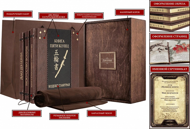 ИСКУССТВО ВОЙНЫ (В 3 ТОМАХ) ОФОРМЛЕНИЕ Составной переплет «Брадель», ручной работы, выполнен из комбинации натуральных кож (кожа «Marma Rossa», кожа «Plonge Brown» производства итальянской кожевенной фабрики «Claudio»). Обложки книг оформлены рельефным золотым тиснением, латунными холитенами (цвет «Gold», количество 12 штук), плетенным кожаным шпагатом. Обрез блока вручную полирован и позолочен. Сертификат. В комплекте бархатный чехол. Формат комплекта - 205х290х32 мм. Вес – 1,1 кг. 205х290х32 мм. Вес – 1,1 кг. СОДЕРЖАНИЕ Древний китайский трактат «искусство войны», написанный более двух тысяч лет назад таинственным воином и философом Сунь-цзы, - классическое руководство по стратегии поведения в конфликтах любого уровня - от психологического соперничества до военных действий. В данном переводе трактат представлен в контексте даосской философии. Характерные для даосизма представления о человеческой природе, сущности возникающих конфликтов и способах разрешения конфликтных ситуаций дают возможность применять силу без грубого насилия и побеждать еще до начала открытого противостояния. С этой точки зрения «Искусство войны» может считаться настольной книгой политиков, политологов и психологов. Для более ясного понимания идей, изложенных в трактате, его текст сопровождается комментариями одиннадцати китайских стратегов и военачальников. Издание иллюстрировано репродукциями произведений изобразительного искусства Китая, Японии и Кореи из музеев, галерей и частных коллекций многих стран мира. Количество – страниц 224 стр. (Мелованная бумага) Дао дэ цзин. Книга о пути и его силе Дао дэ цзин - книга, которая уже около 2500 лет не перестает удивлять и просветлять людей. Глубокие афоризмы, тонкие метафоры и удивительные парадоксы древнекитайского мудреца Лао-цзы дают ключ ко многим тайнам природы, общества и человеческого «Я». Книга учит простоте, скромности и недеянию - основам философии даосизма. Джон Макдональд, автор данного перевода, изучил несколько различных версий оригинального текста Дао дэ цзина, чтобы сравнить их и лучше понять изначальный смысл документа. В этом иллюстрированном издании использованы редкие китайские картины, показывающие «правильную» даосскую жизнь во всей ее красоте и мудрости. Количество страниц – 128 (мелованная бумага, цветная печать) Книга пяти колец. Книга клана об искусстве войны В этой книге представлены два важнейших текста средневековой воинской культуры Японии. «Книгу Пяти Колец» написал Миямото Мусаси - легендарный ронин (самурай, не имеющий господина). «Книгу клана об искусстве войны» - Ягю Мунэнори, мастер-мечник, наставник самого сегуна и глава его тайной службы. Так же как и автор древнего китайского трактата «Искусство войны» Сунь-цзы, Миямото Мусаси и Ягю Мунэнори говорят об универсальных принципах получения решающего превосходства в конфликтах любого уровня. При этом они достигают вершин осмысления темы исходя из собственного опыта схваток с противником, что делает их тексты поистине уникальными. Книга знакомит с историей и культурой Японии, дает представление об истоках стойкости японского духа и актуальна для тех, кто готов увидеть в конфликте ресурс своих новых возможностей. И конечно, она будет полезна людям, практикующим боевые искусства. Количество страниц – 176 (мелованная бумага, цветная печат