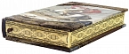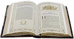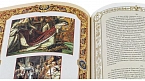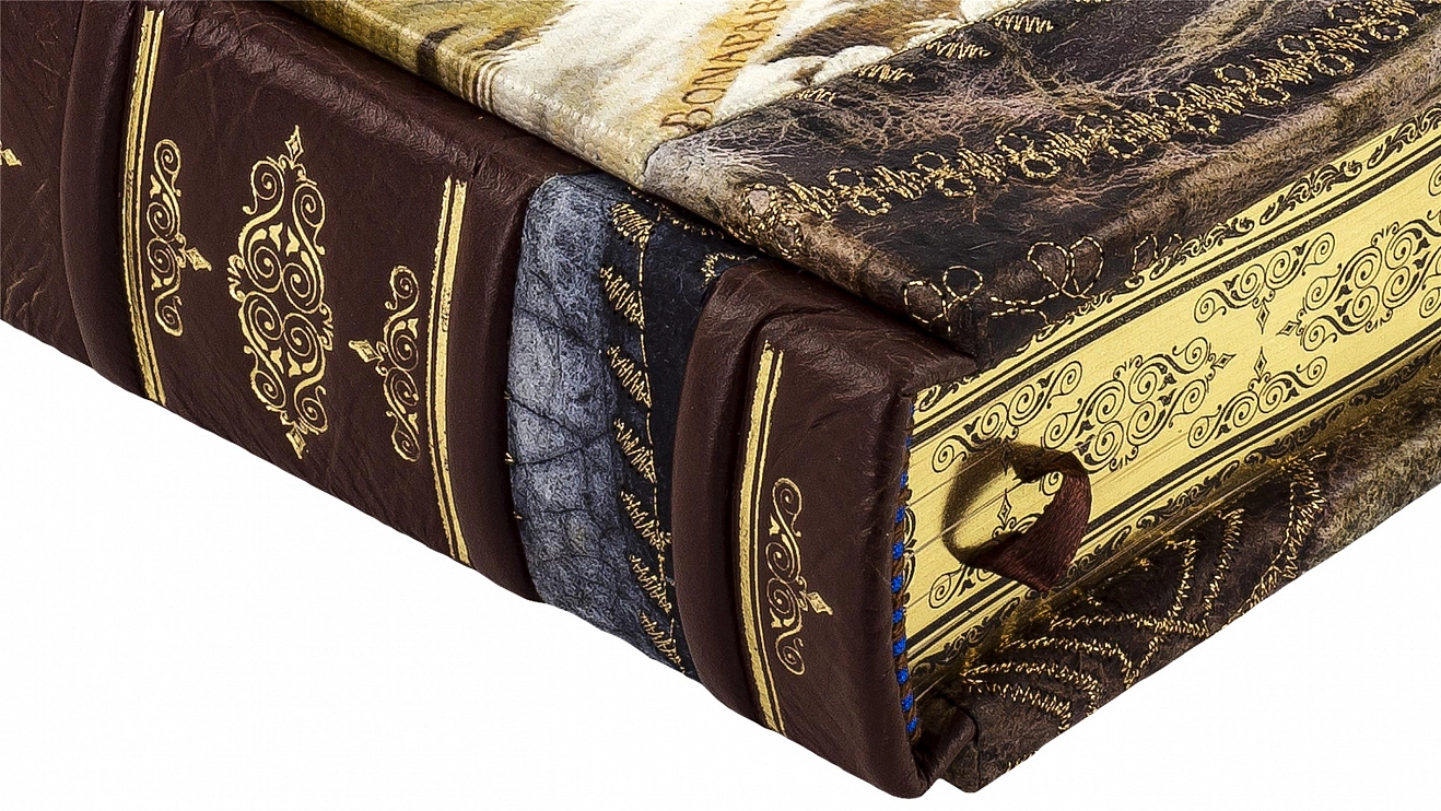 Составной переплет «Брадель» ручной работы, выполнен из натуральной кожи «Cavalli» производства итальянской кожевенной фабрики «Claudio». Обложка книги оформлена рельефным золотым тиснением (использована фольга «Luxor 240») и вставками из холста с художественной фотопечатью. Обрез книги выполнен в уникальной технике золочения с нанесением орнамента.