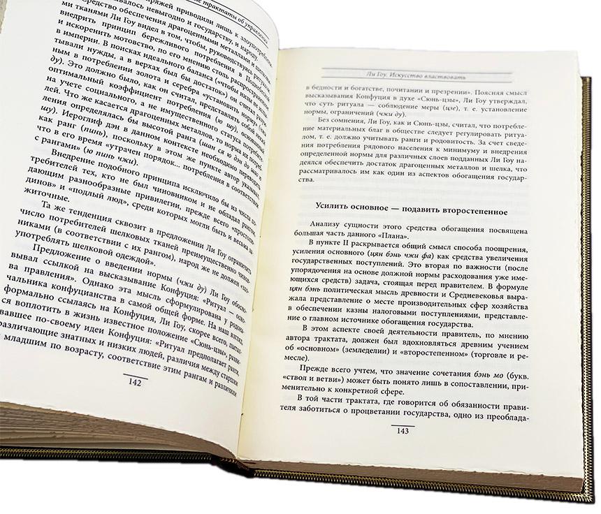 Подарочная книга "Книга власти. Древневосточные трактаты об управлении" (в футляре) АННОТАЦИЯ «Книга власти. Древневосточные трактаты об управлении» включает в себя работы выдающегося китайского философа Ли Гоу и индийского царского министра Каутильи. Эти труды были написаны для правителей и государственных деятелей о власти и управлении государством и людьми. ОПИСАНИЕ Цельнокожаный переплёт ручной работы, украшен цветной кожаной вставкой, а также золотым и блинтовым тиснением. Корешок декорирован бинтами. Текст книги напечатан на бумаге Palatina Avorio 100 Австрийского производства. Обрез оформлен в технике торшонирование. Ляссе из шёлковой ленты. Форзац цельный из дизайнерской бумаги. Дублюра откатана золотом. Футляр кожаный, вдохновлён дизайном книги. Книга представлена в оригинальном подарочном коробе, перчатки и, по желанию, сертификат (может быть именным) в комплекте. Цветовое сочетание переплёта и упаковки может отличаться от представленных на фото.
