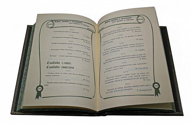 Кодекс вождей и политиков всех времен и народов АННОТАЦИЯ Книга представляет собой собрание афоризмов, крылатых слов, изречений политических и общественных деятелей. Перед читателем предстанет своеобразный парад мудрецов многих стран, времен и народов, начиная с глубокой древности и до наших дней. Ряд из этих образных выражений хорошо известны и весьма популярны, немало и таких, которые встречаются впервые. Сборник систематизирован по тематическим разделам и в алфавитном порядке, сопровождается введением и указателем основных имен, которые призваны помочь читателю сориентироваться в мире афоризмов. ОПИСАНИЕ Цельнокожаный переплёт ручной работы, украшен золотым и блинтовым тиснением. Корешок декорирован бинтами. Текст книги напечатан на офсетной бумаге . Обрез оформлен в технике "Перо павлина". Ляссе из шёлковой ленты. Форзац цельный из дизайнерской бумаги. Дублюра окатана золотом. Книга представлена в оригинальной подарочной упаковке. Цветовое сочетание переплёта и упаковки может отличаться от представленных на фото.