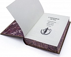 Художественный стиль переплета, индивидуальный дизайн тиснения на коже. Отпечатана на дизайнерской бумаге «Ozon Ivory», блок страниц тонирован с нанесением золотого орнамента. полностью ручная работа.