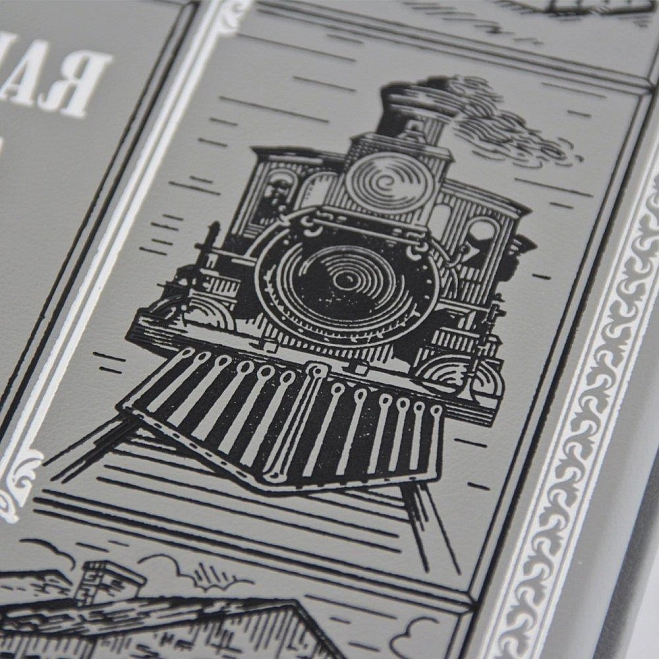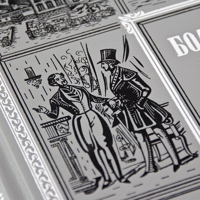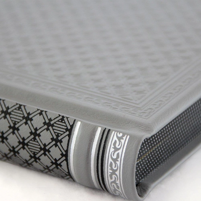 Переплёт ручной работы из натуральной кожи. Форзац из дизайнерской бумаги. 4 бинта на корешке, ручной обработки. Каптал серебряный из натуральной кожи. Обрез блока закрас с торшонированием серебром. Тиснение блинтовое, серебряной и черной фольгой. Ляссе.
