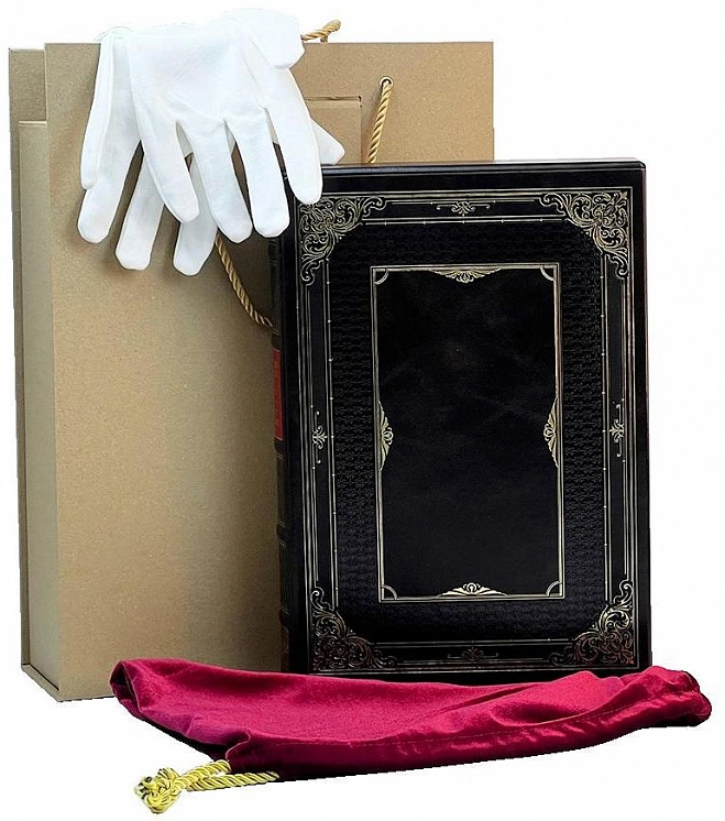 Цельнокожаный переплёт ручной работы, украшен цветной кожаной вставкой, а также золотым и блинтовым тиснением. Корешок декорирован бинтами. Текст книги напечатан на бумаге Palatina Avorio 100 Австрийского производства. Обрез оформлен в технике торшонирование. Ляссе из шелковой ленты. Форзац цельный из дизайнерской бумаги. Дублюра окатана золотом. Футляр кожаный, вдохновлен дизайном книги.