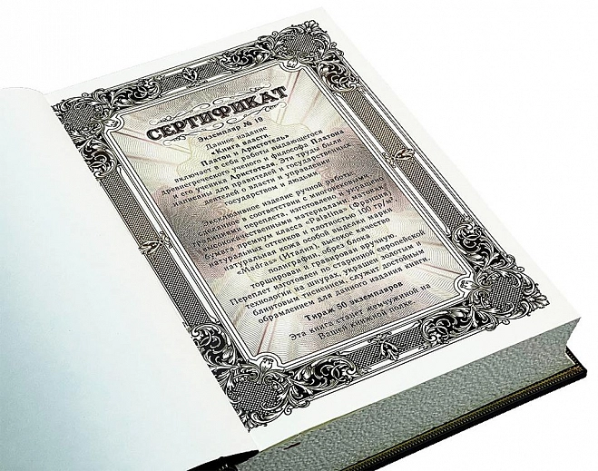 Подарочное издание "Книга власти. Платон, Аристотель" (в футляре) АННОТАЦИЯ Издание включает в себя работы выдающегося древнегреческого философа Платона и его ученика Аристотеля. Эти труды были написаны для правителей и государственных деятелей о власти и управлении государством и людьми. ОПИСАНИЕ Цельнокожаный переплёт ручной работы, украшен цветной кожаной вставкой, а также золотым и блинтовым тиснением. Корешок декорирован бинтами. Текст книги напечатан на бумаге Palatina Avorio 100 Австрийского производства . Обрез оформлен в технике торшонирование. Ляссе из шелковой ленты. Форзац цельный из дизайнерской бумаги. Дублюра окатана золотом. Футляр кожаный, вдохновлен дизайном книги. Книга представлена в оригинальном подарочном коробе. Цветовое сочетание переплёта и упаковки может отличаться от представленных на фото.