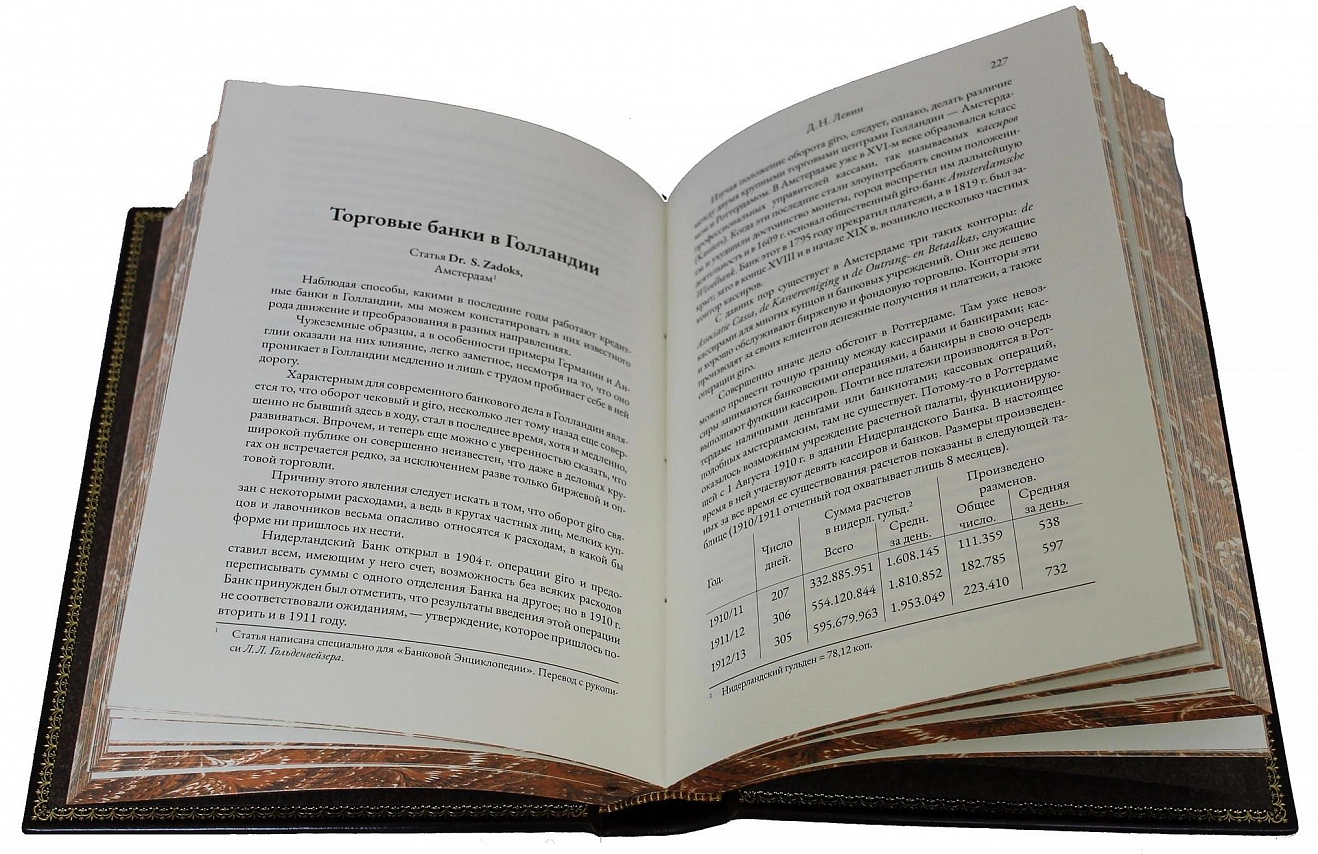 Банковая энциклопедия (в 2-х томах) АННОТАЦИЯ Интереснейшее подарочное издание «Банковской энциклопедии» в 2-х томах. Репринт книги 1914 года выпуска. Редакция выдающегося экономиста, финансиста и политического деятеля царских времён – профессора Леонида Николаевича Яснопольского.Уникальный сборник согласованных по тематике развёрнутых глав, написанных разными авторами, включая Яснопольского. Первый том даёт краткую историю банковского дела в мире, описывает деятельность банковских организаций в передовых экономически развитых странах. Включена информация о деятельности соответствующих структур в России, но в основном представлен только Государственный банк и его операции. Второй том, о биржах, раскрывает вопрос значительно полнее. Излагается общая история развития финансовых учреждений. Представлена информация по западным биржам с упором на их деятельность в США, Франции, Великобритании, Германии и Австро-Венгрии. Отличается полнотой рассказ о российских финансовых учреждениях. Раскрываются особенности проведения формальных, разрешённых биржевых операций и действительная биржевая практика. Книга написана профессионалами банковского дела. Отличается деловым стилем изложения с приведением конкретных примеров. Издание для читателя, хорошо разбирающегося в финансовых вопросах либо глубоко интересующегося денежной историей государства. Репринтное издание представлено в классической стилистике переплета, выполненом вручную из высококачественной кожи растительного дубления. Дизайн двухтомника дополняют сочетание блинтового и золотого тиснения, кожаная вставка, выполненная из другого вида кожи. Высококачественная мелованная бумага книжного блока. Форзацы оформлены дублюрами. Ляссе. ОПИСАНИЕ Богато оформленное репринтное собрание, представлено в подарочном издании. Французский Цельнокожаный переплёт ручной работы, украшен цветной кожаной вставкой,а также блинтовым ицветным тиснением. Корешок декорирован бинтами.Текст книг напечатан на бумаге Munken Print Cream Шведского производства . Обрез оформлен в технике "Перо павлина". Ляссе из шёлковой ленты. Форзац цельный из дизайнерской бумаги.Дублюра окатана золотом. Собрание представлено в оригинальном подарочном коробе, перчатки и, по желанию, сертификат (может быть именным) в комплекте. Цветовое сочетание переплёта и упаковки может отличаться от представленных на фото.