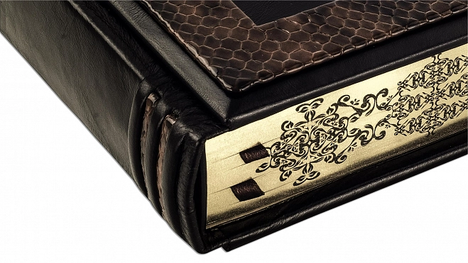 Составной переплет «Брадель», ручной работы, изготовлен из комбинации натуральной кожи (кожа «Caffè nero», кожа морской змеи производства итальянской кожевенной фабрики «Benericetti»). Обложка книги оформлена рельефным золотым тиснением. Обрез книги выполнен в уникальной технологии художественной запечатки золотой основы.