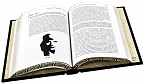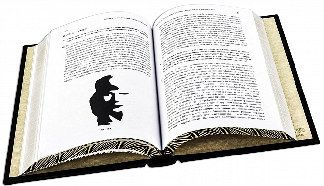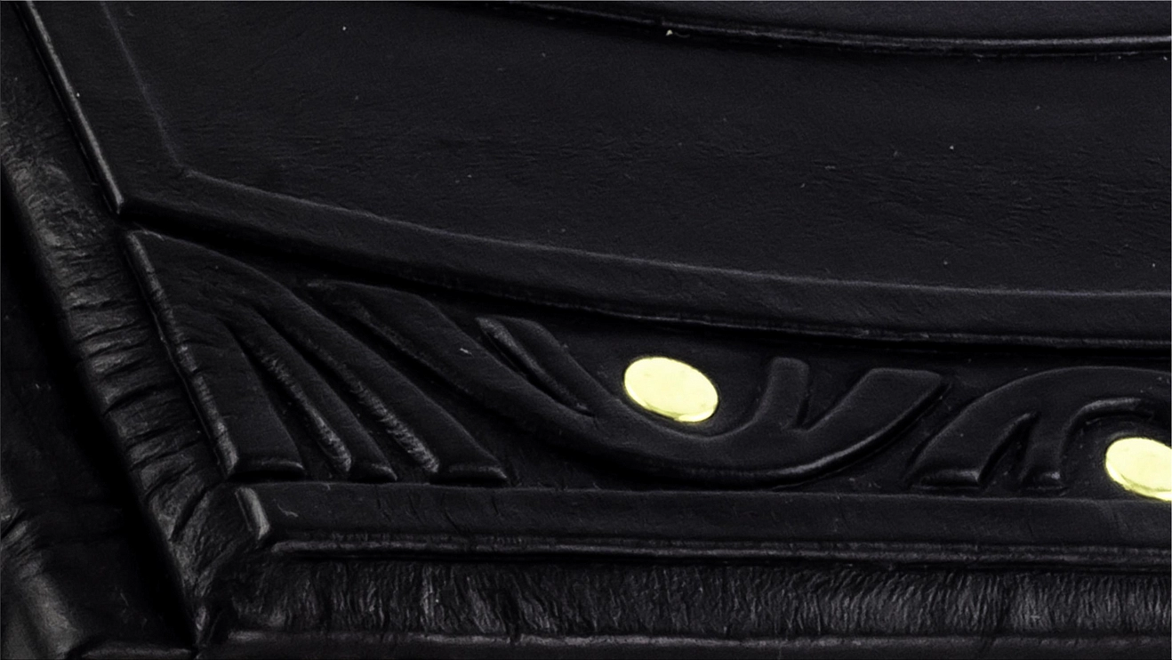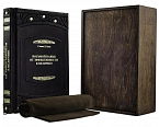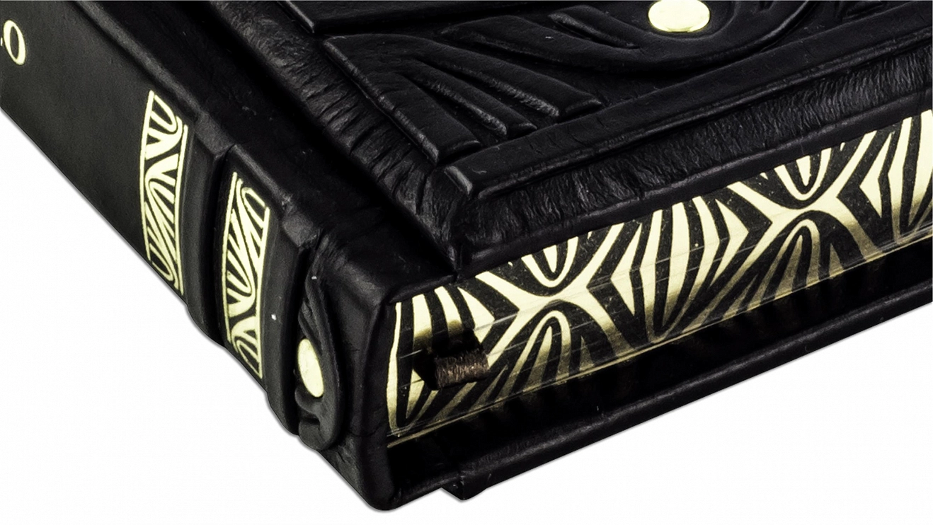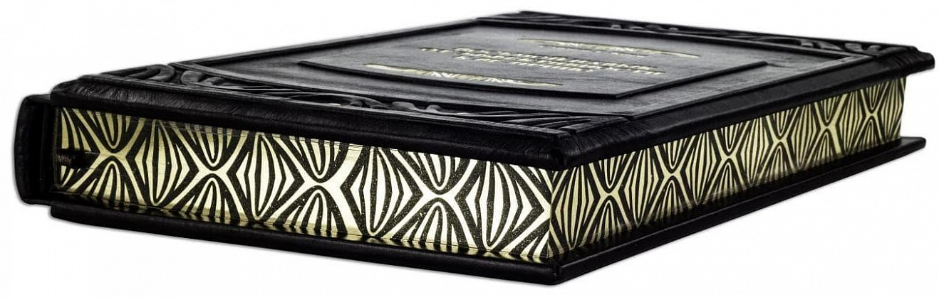 Составной переплет «Брадель», ручной работы, изготовлен из натуральной итальянской кожи теленка «Marrone». Обложка книг оформлена объемными узорами ручного тиснения, рельефным тиснением золотой фольгой «Luxor» в 24 карата, холитенами (цвет «Gold»), количеством 8 шт. Обрез книги выполнен в уникальной технологии художественной запечатки золотой основы.