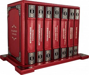 Составной переплет «Брадель», ручной работы, выполнен из натуральной кожи теленка «Scarlett Rosso» производства итальянской кожевенной фабрики «Carisma». Обложки книг двухуровневые, оформлены объемными узорами ручного тиснения, декорированы рельефным тиснением, c использованием золотой и черной фольги «Luxor 240». Обрезы выполнены в уникальной технологии художественной запечатки золотой основы. Футляр выполнен в том же стиле, что и книги.