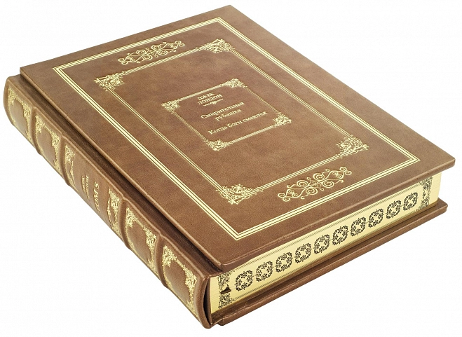 Составной переплет «Брадель» ручной работы, выполнен из натуральной кожи «Pullup Brown» производства итальянской кожевенной фабрики «Carisma». Обложка книги оформлена рельефным золотым тиснением с использованием фольги «Luxor 240». Обрез книги выполнен в авторской технике позолоты с нанесением орнамента.