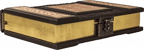 Переплет изготовлен по старинной европейской технологии: блок из французской дизайнерской бумаги сшит вручную на шнуры и «одет» в переплетную крышку из шагреневой кожи ручного дубления (Франция). Обложка и корешок украшены вставками из белой кожи с ручной росписью. Верхний обрез позолочен и огравирован вручную, Правый и нижний обрезы окрашены в два цвета и также отгравированы вручную. Дублюра оформлена шелковым муаром и ручной накаткой бордюрного орнамента. Для книги изготовлен индивидуальный футляр с кожаной окантовкой.