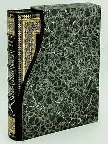 Французский цельнокожаный переплет ручной работы на шнурах.. Форзац составной из мраморной бумаги на кожаной слизуре. Каптал двойной наборный, ручное плетение из шелковых нитей. Обрез окрашенный с тиснением золотой фольгой. Переплет украшен ювелирным литьем из латуни, покрытым золотом 24 Кт.