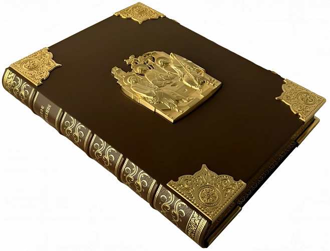 Подарочная книга "Русское иконописание" АННОТАЦИЯ Эта книга посвящена русской иконе как сакральному - благодатному образу. Икона представляет собою молитвенное - безмолвное песнопение во славу Божию. Выполненная красками, как картина, она больше нежели произведение искусства, ибо является носителем благодати. Благодатный образ обращен к душе человеческой, и его молитвенное и даже просто сосредоточенное безмолвное восприятие оставляет на душе человека неизгладимую печать Добра и Света. ОПИСАНИЕ Французский цельнокожаный переплет ручной работы на шнурах.. Форзац составной из мраморной бумаги на кожаной слизуре. Каптал двойной наборный, ручное плетение из шелковых нитей. Обрез окрашенный с тиснением золотой фольгой. Переплет украшен ювелирным литьем из латуни, покрытым золотом 24 Кт.