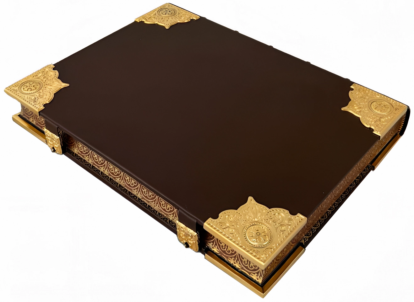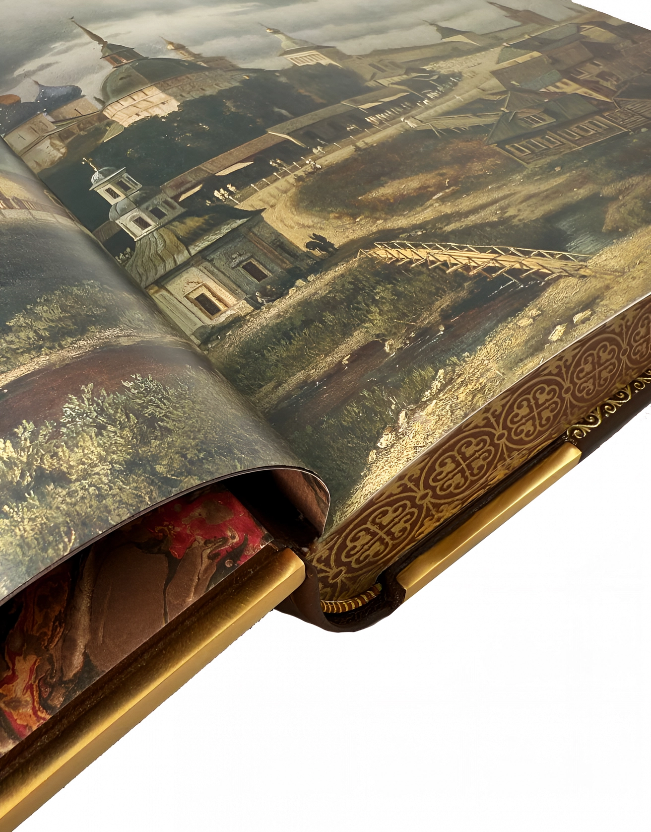 Подарочная книга "Русское иконописание" АННОТАЦИЯ Эта книга посвящена русской иконе как сакральному - благодатному образу. Икона представляет собою молитвенное - безмолвное песнопение во славу Божию. Выполненная красками, как картина, она больше нежели произведение искусства, ибо является носителем благодати. Благодатный образ обращен к душе человеческой, и его молитвенное и даже просто сосредоточенное безмолвное восприятие оставляет на душе человека неизгладимую печать Добра и Света. ОПИСАНИЕ Французский цельнокожаный переплет ручной работы на шнурах.. Форзац составной из мраморной бумаги на кожаной слизуре. Каптал двойной наборный, ручное плетение из шелковых нитей. Обрез окрашенный с тиснением золотой фольгой. Переплет украшен ювелирным литьем из латуни, покрытым золотом 24 Кт.