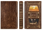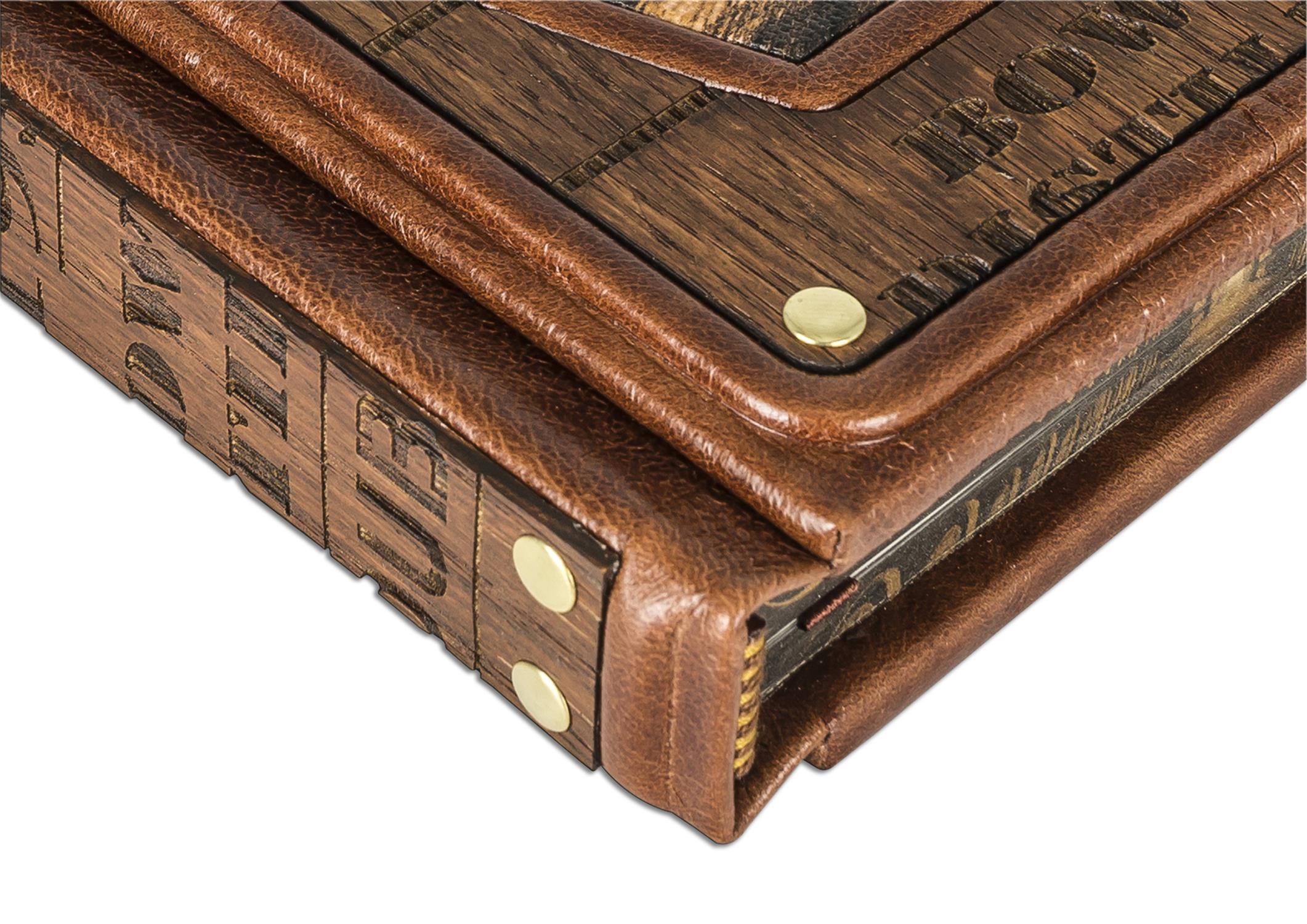 Составной переплет «Брадель», ручной работы, выполнен из кожи «Robbat Cognac» производства итальянской кожевенной фабрики «Claudio». Обложка книги двухуровневая, оформлена рельефным золотым тисненем, с использованием фольги «Luxor 240», декорирована хольнитенами цвета Gold, количеством 16 штук, вставками из на натурального дерева и холстом с художественной фотопечатью. Обрез выполнен в уникальной технологии художественной запечатки золотой основы.