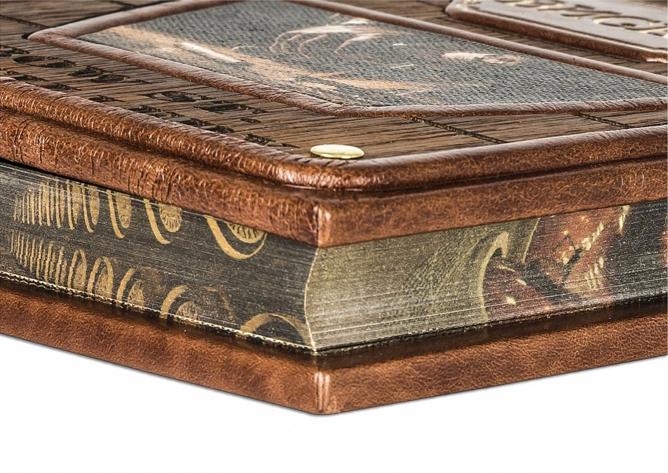 Составной переплет «Брадель», ручной работы, выполнен из кожи «Robbat Cognac» производства итальянской кожевенной фабрики «Claudio». Обложка книги двухуровневая, оформлена рельефным золотым тисненем, с использованием фольги «Luxor 240», декорирована хольнитенами цвета Gold, количеством 16 штук, вставками из на натурального дерева и холстом с художественной фотопечатью. Обрез выполнен в уникальной технологии художественной запечатки золотой основы.