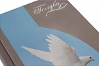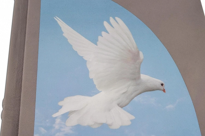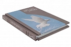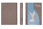 Составной переплет «Брадель», ручной работы, выполнен из натуральной кожи «Metallico» производства итальянской кожевенной фабрики «Carisma». Обложка книги оформлена рельефным серебряным тиснением, с использованием фольги «Luxor 240», декорирована изображением на холсте. Обрез блока вручную полирован и посеребрен.