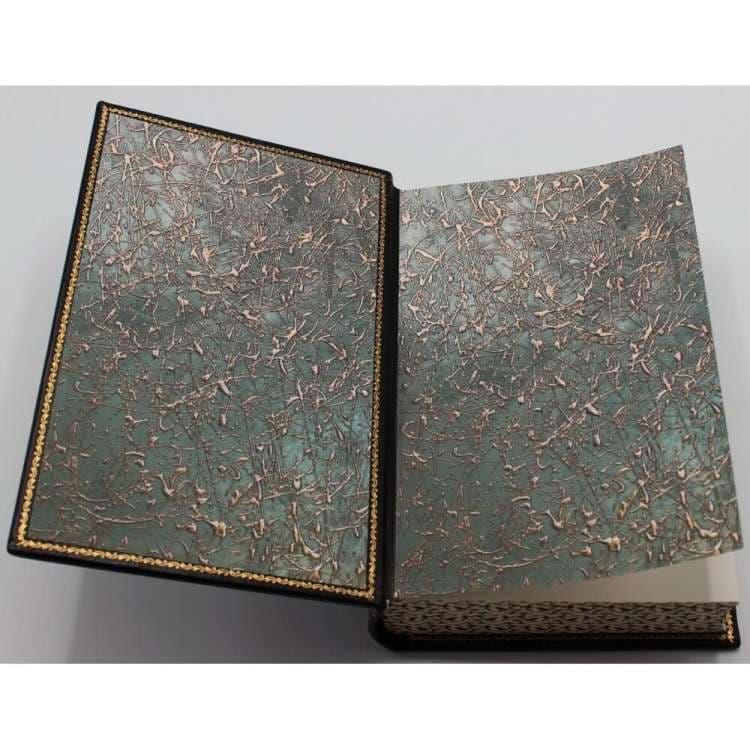 Шагреневая переплетная кожа, исторический французский переплет, полностью ручная работа. Блок страниц вручную отшлифован и тонирован, цветное тиснение по коже. Футляр ручной работы.