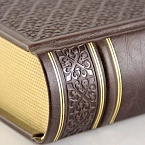 Переплёт ручной работы из натуральной кожи. Форзац из дизайнерской бумаги. 4 бинта на корешке, ручной обработки. Каптал золотой из натуральной кожи. Обрез блока торшонированный золотой. Тиснение блинтовое и золотой фольгой. Ляссе.