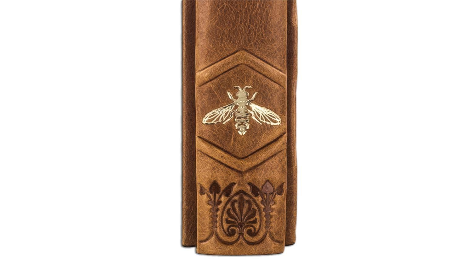 Составной переплет «Брадель», ручной работы, выполнен из натуральной кожи «Marrone e oro», производства итальянской кожевенной фабрики «Benericetti». Обложка книги двухуровневая, декорирована объемными узорами ручного тиснения, оформлена многоуровневым тиснением: глубоким блинтовым и рельефным золотым, с использованием фольги «Luxor 240». Обрез книги выполнен в уникальной технологии художественной запечатки золотой основы.