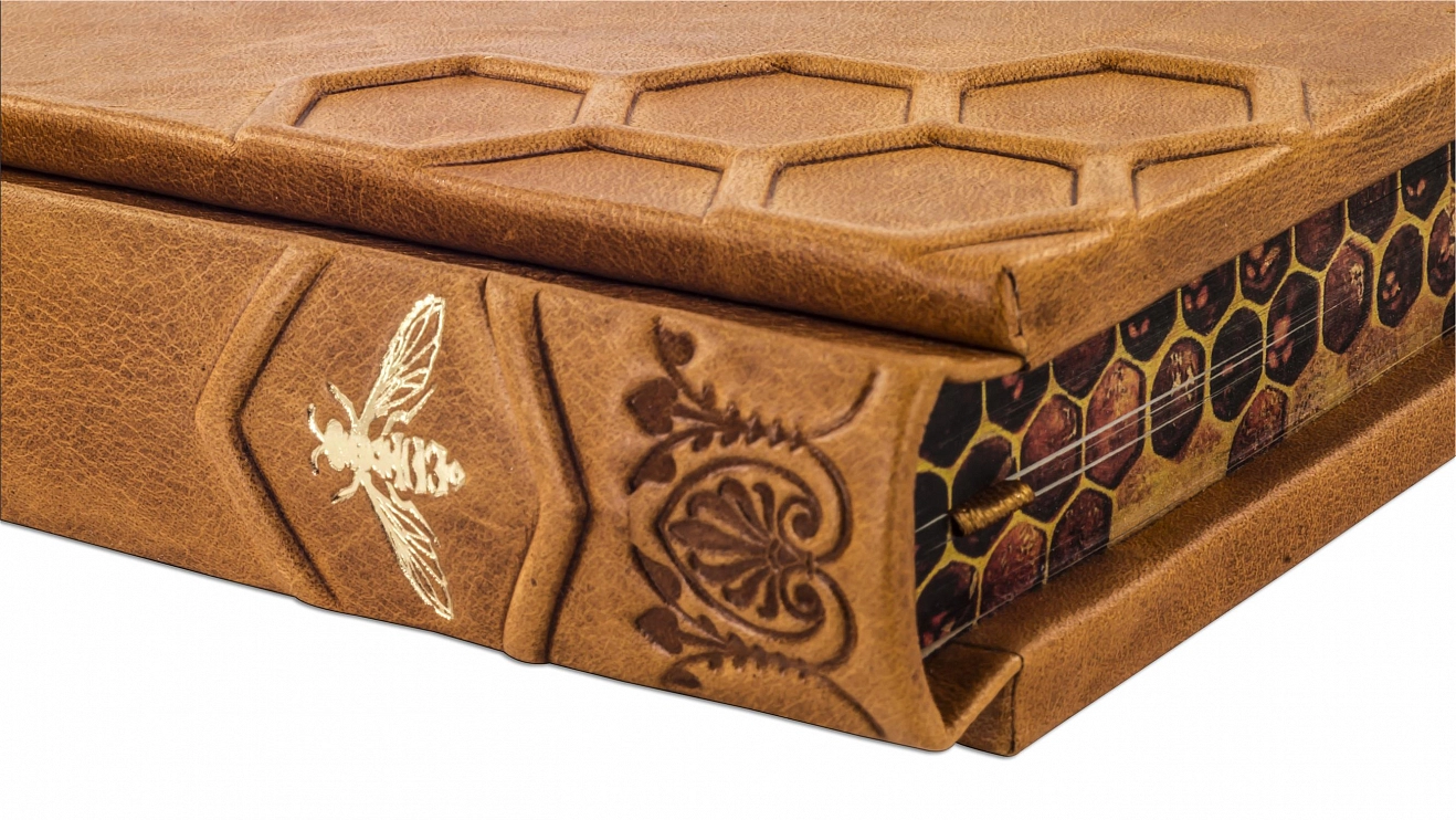 Составной переплет «Брадель», ручной работы, выполнен из натуральной кожи «Marrone e oro», производства итальянской кожевенной фабрики «Benericetti». Обложка книги двухуровневая, декорирована объемными узорами ручного тиснения, оформлена многоуровневым тиснением: глубоким блинтовым и рельефным золотым, с использованием фольги «Luxor 240». Обрез книги выполнен в уникальной технологии художественной запечатки золотой основы.
