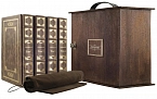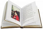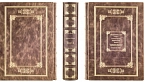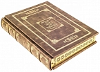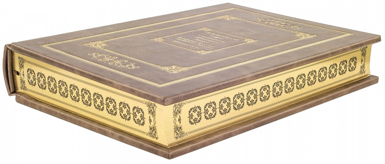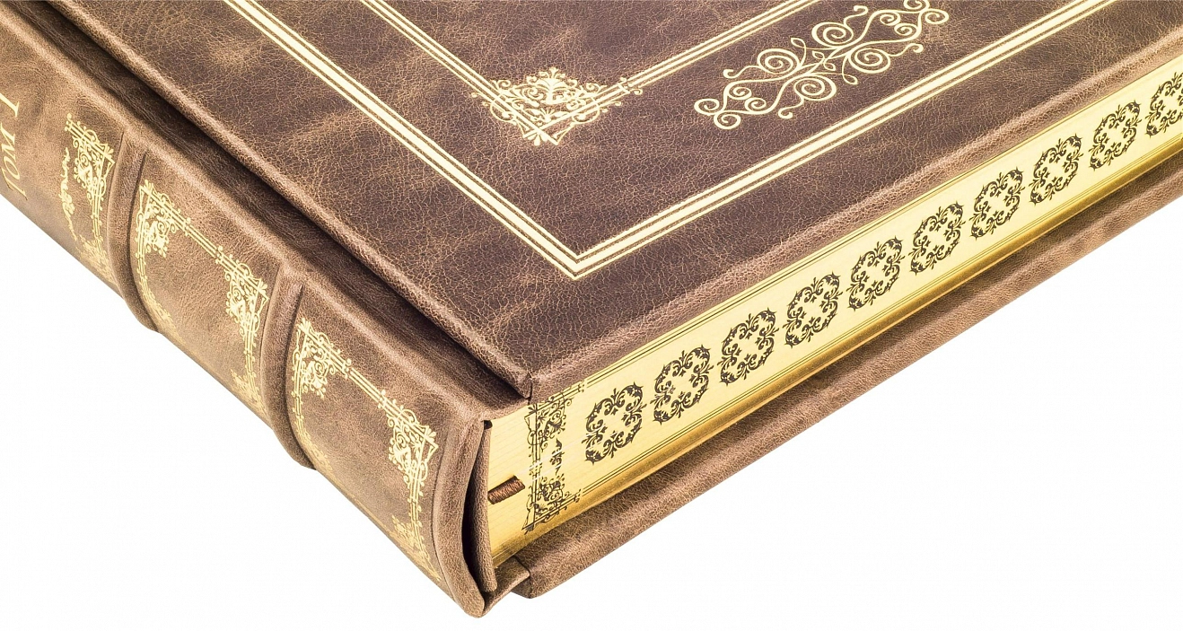 Составной переплет «Брадель» ручной работы, выполнен из натуральной кожи «Pullup Brown» производства итальянской кожевенной фабрики «Carisma». Обложка книги оформлена рельефным золотым тиснением с использованием фольги «Luxor 240». Обрез книги выполнен в авторской технике позолоты с нанесением орнамента.