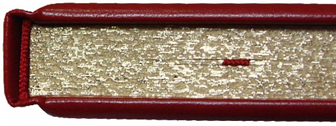 Переплет ручной работы. Натуральная переплетная кожа. Каптал из шелковых нитей. Ляссе шелковое. Обрез торшонированный золотой фольгой. Украшение переплета: блинтовое тиснение, тиснение полиграфической фольгой, полиграфическая вставка.